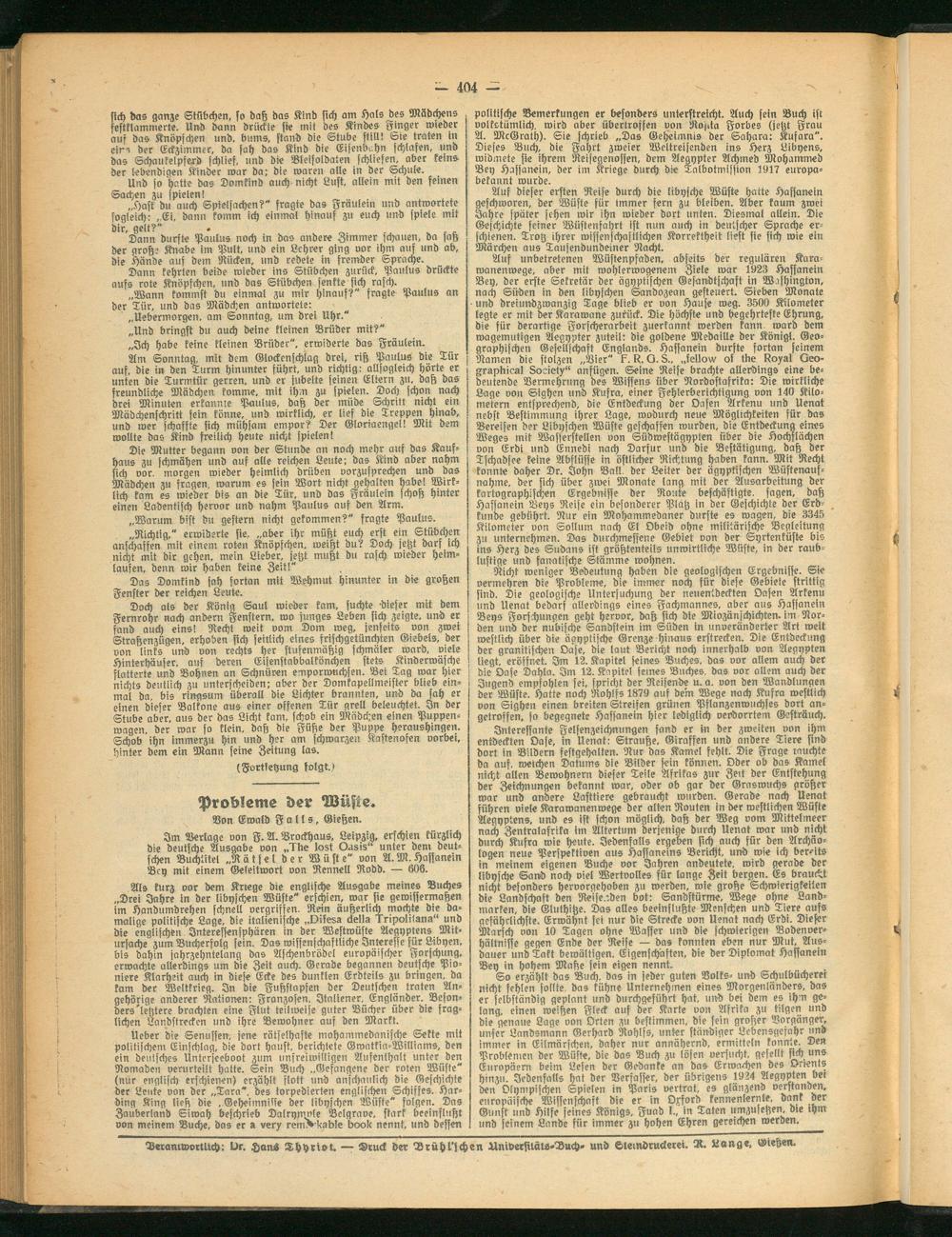 So erzählt das Buch, das in jeder guten Volks- und Schulbücherei nicht fehlen sollte, das kühne Unternehmen eines Morgenländers, das er selbständig geplant und durchgeführt hat, und bei dem es ihm gelang, einen weißen Fleck auf der Karte von Afrika zu tilgen und die genaue Lage von Orten zu bestimmen, die fein großer Vorgänger, unser Landsmann Gerhard Rohlfs, unter ständiger Lebensgefahr und immer in Eilmärschen, daher nur annähernd, ermitteln kannte. Den Problemen der Wüste, die das Buch zu lösen versucht, gesellt sich uns (Europäern beim Lesen der Gedanke an das Erwachen des Orients hinzu. Jedenfalls hat der Derfaffer, der übrigens 1924 Aegypten bei den Olympischen Spielen in Poris vertrat, es glänzend verstanden, europäische Wissenschaft die er in Oxford tennenlernte, dank der Gunst iind Hilfe seines Königs, Fuad L, in Taten umzusetzen, die ihm und seinem Lande für immer zu hohen Ehren gereichen werden.