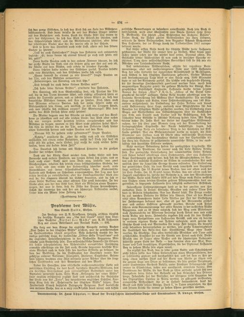 Nicht weniger Bedeutung haben die geologischen Ergebnisse. Sie vermehren die Probleme, die immer noch für diese Gebiete strittig sind. Die geologische Untersuchung der neuentdeckten Oasen Arkenu und Uenat bedarf allerdings eines Fachmannes, aber aus Hassanein Beys Forschungen geht hervor, daß sich die Miozänschichten, im Norden und der nudische Sandstein im Süden in unveränderter Art weit westlich über die ägyptische Grenze hinaus erstrecken. Die Entdeckung der granitischen Oase, die laut Bericht noch innerhalb von Aegypten liegt, eröffnet. Im 12. Kapitel [eines Buches, das vor allem auch der die Oase Dahla. Im 12. Kapitel fernes Buches, das vor allem auch der Jugend empfohlen fei, spricht der Reisende u. a. von den Wandlungen der Wüste. Hatte noch Rohlfs 1879 auf dem Wege nach Kusra westlich von Sighen einen breiten Streifen grünen Pflanzenwuchses dort an- geirofsen, so begegnete Hassanein hier lediglich verdorrtem G-esträuch.