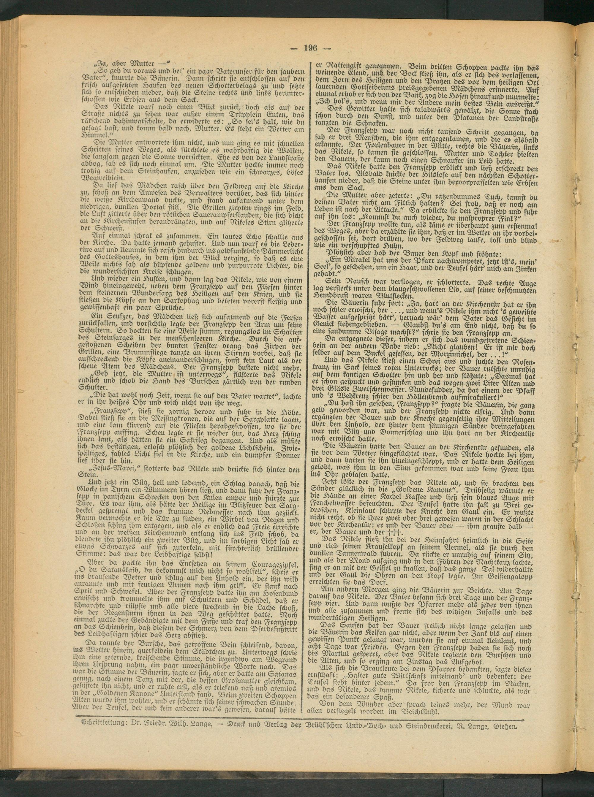Als sich die Brautleute bei dem Pfarrer bedankten, sagte dieser ernsthaft: „Lastet gute Wirtschaft miteinand' und bedenket: der -Teufel steht hinter jedem." Da fror den Franzsepp im Nacken, und das Rikele, das dumme Rikele, kicherte und schluckte, als wär das ein besonderer Spaß.