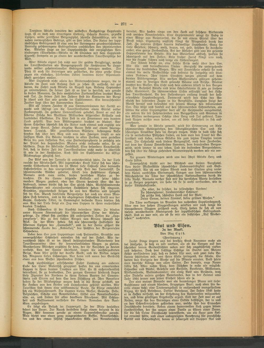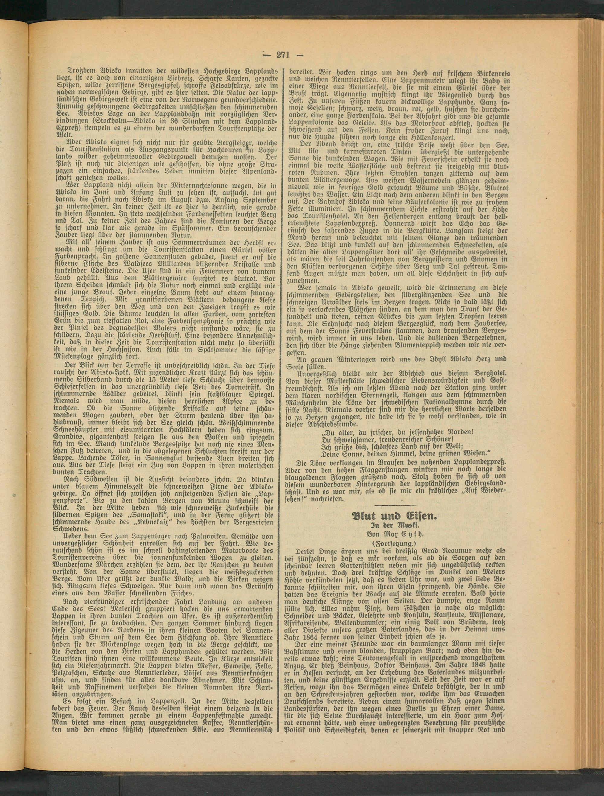 Der Blick von der Terrasse ist unbeschreiblich schön. In der Tiefe rauscht der Wisko-Jokk. Mit jugendlicher Kraft stürzt sich das schäumende Silberband btirii) die 15 Meter tiefe Schlucht über bemooste Schleferfelsen in das unergründlich tiefe Bett des Torneträsk. In schlummernde Wälder gebettet, blinkt fein stahlblauer Spiegel. Niemals wird man müde, diesen herrlichen Alpsee zu betrachten. Ob die Sonne blitzende Kristalle auf seine schäumenden Wogen zaubert, oder der Sturm heulend über ihn dahinbraust, immer bleibt sich der See gleich schön. Weißschimmernde Schneehäupter mit eisumstarrten Hochtälern heben sich ringsum. Grandios, gigantenhaft steigen sie aus den Wolken und spiegeln sich im See. Manch funkelnde Bergesspitze hat noch nie eines Menschen Fuß betreten, und in die abgelegenen Schluchten streist nur der Lappe. Lachende Täler, in Sonnenglut duftende Auen breiten sich aus. Aus der Tiefe steigt ein Zug von Lappen in ihren malerischen bunten Trachten.