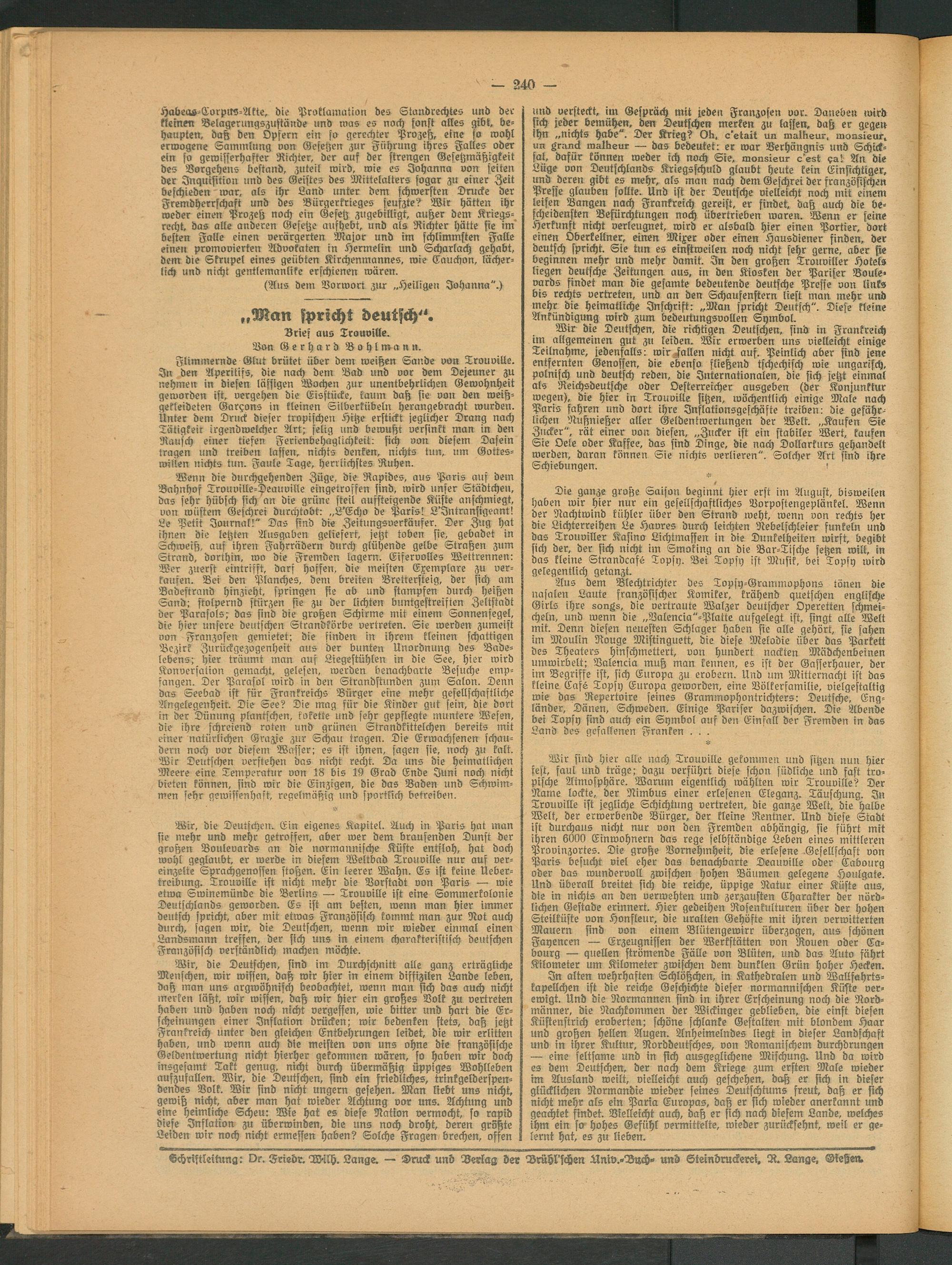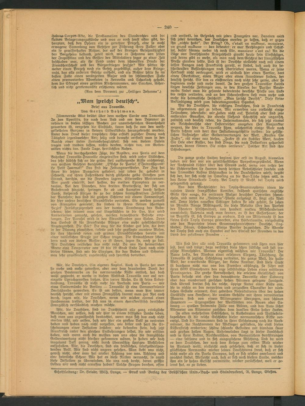 und versteckt, im Gespräch mit jeden Franzosen vor. Daneben wird sich jeder bemühen, den Deutschen merken zu lassen, daß er gegen ihn „nichts habe". Der Krieg? Oh, c'etait un malheur, monsieur, an grand malheur — das bedeutet: er war Verhängnis und Schicksal, dafür können weder ich noch Sie, monsieur c’est <?a! An die Lüge von Deutschlands Kriegsschuld glaubt heute kein Einsichtiger, und deren gibt es mehr, als man nach bem Geschrei der französischen Presse glauben sollte. Unb ist der Deutsche vielleicht noch mit einem leisen Bangen nach Frankreich gereist, er findet, daß auch die bescheidensten Befürchtungen noch übertrieben waren. Wenn er seine Herkunft nicht verleugnet, wirb er alsbalb hier einen Portier, dort einen Oberkellner, einen Mixer oder einen Hausdiener finden, der deutsch spricht. Sie tun es einstweilen noch nicht sehr gerne, aber sie beginnen mehr und mehr damit. In den großen Trouviller Hotels liegen deutsche Zeitungen aus, in den Kiosken der Pariser Boulevards findet man die gesamte bedeutende deutsche Presse von links bis rechts vertreten, unb an den Schausenstern liest man mehr und mehr bie heimatliche Inschrift: „Man spricht Deutsch". Diese kleine Ankünbigung wirb zum bebeutungsvollen Symbol.