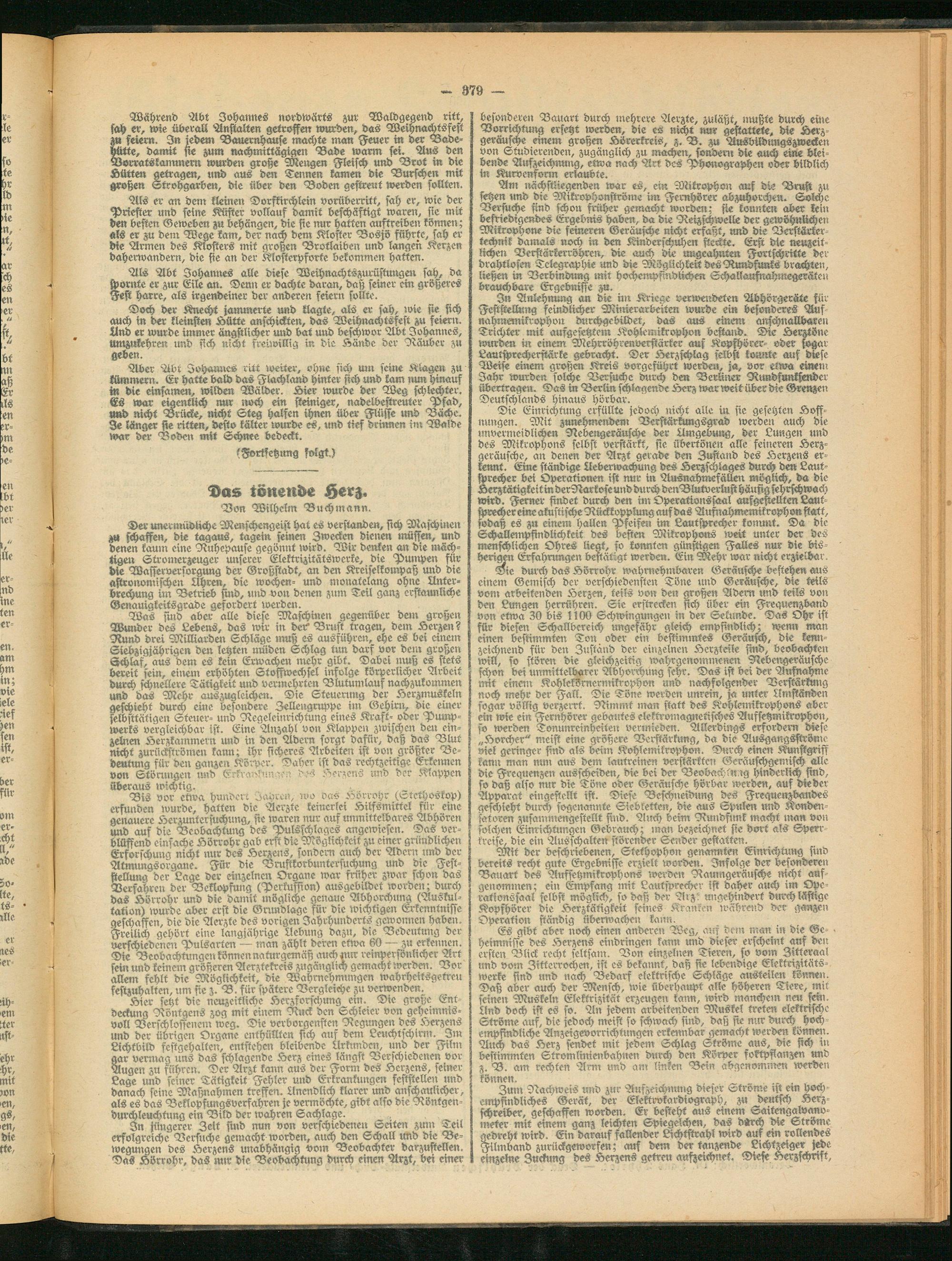 Sn Anlehnung an die im Kriege verwendeten Abhörgeräte für Feststellung feindlicher Mimerarbeiten wurde ein besonderes Auf nahmemikrophon durchgebilder, das aus einem anschnallbaren Trichter mit aufgesetztem Kohlemikrophon bestand. Die Lerztöne Weben in einem Mehrröhrenverstärker auf Kopfhörer- oder sogar Lautsprecherstärke gebracht. Der Lerzschlag selbst konnte auf diese Weise einem großen Kreis vorgeführt werde», ja, vor etwa einem Jahr wurden solche Versuche durch den Berliner Rundfunksender übertragen. Das st» Berlin schlagende Lerz war weit über die Grenzen Deutschlands hinaus hörbar.
