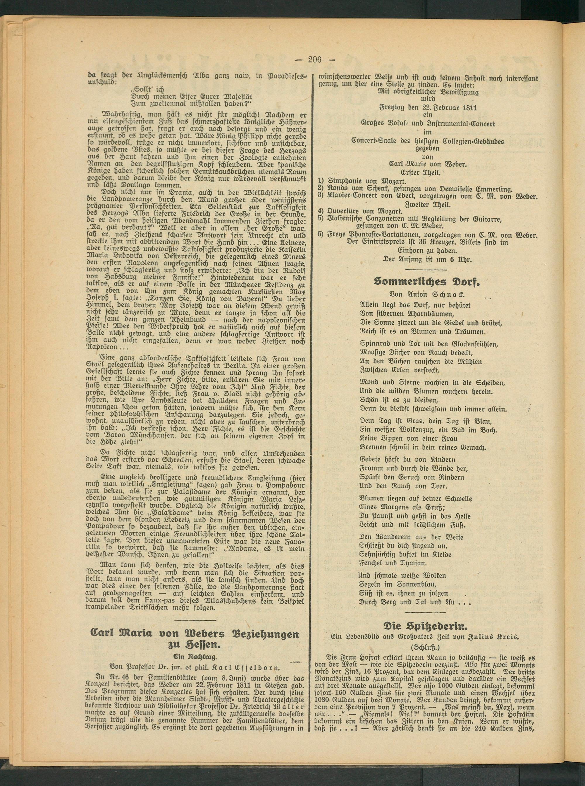 3n Nr. 46 der Familienblätter (vom 8. Juni) wurde über das Konzert berichtet, das Weber am 22. Februar 1811 in Gießen gab. Das Programm dieses Konzertes hat sich erhalten. Der durch seine Arbeiten über die Mannheimer Stadt-, Musik- und Theatergeschichte bekannte Archivar und Bibliothekar Professor Dr. Friedrich Walter wachte cs auf Grund einer Mitteilung, die zufälligerweise dasselbe Datum trägt wie die genannte Nummer der Familienblätter, dem Verfasser zugänglich. Es ergänzt die dort gegebenen Ausführungen in