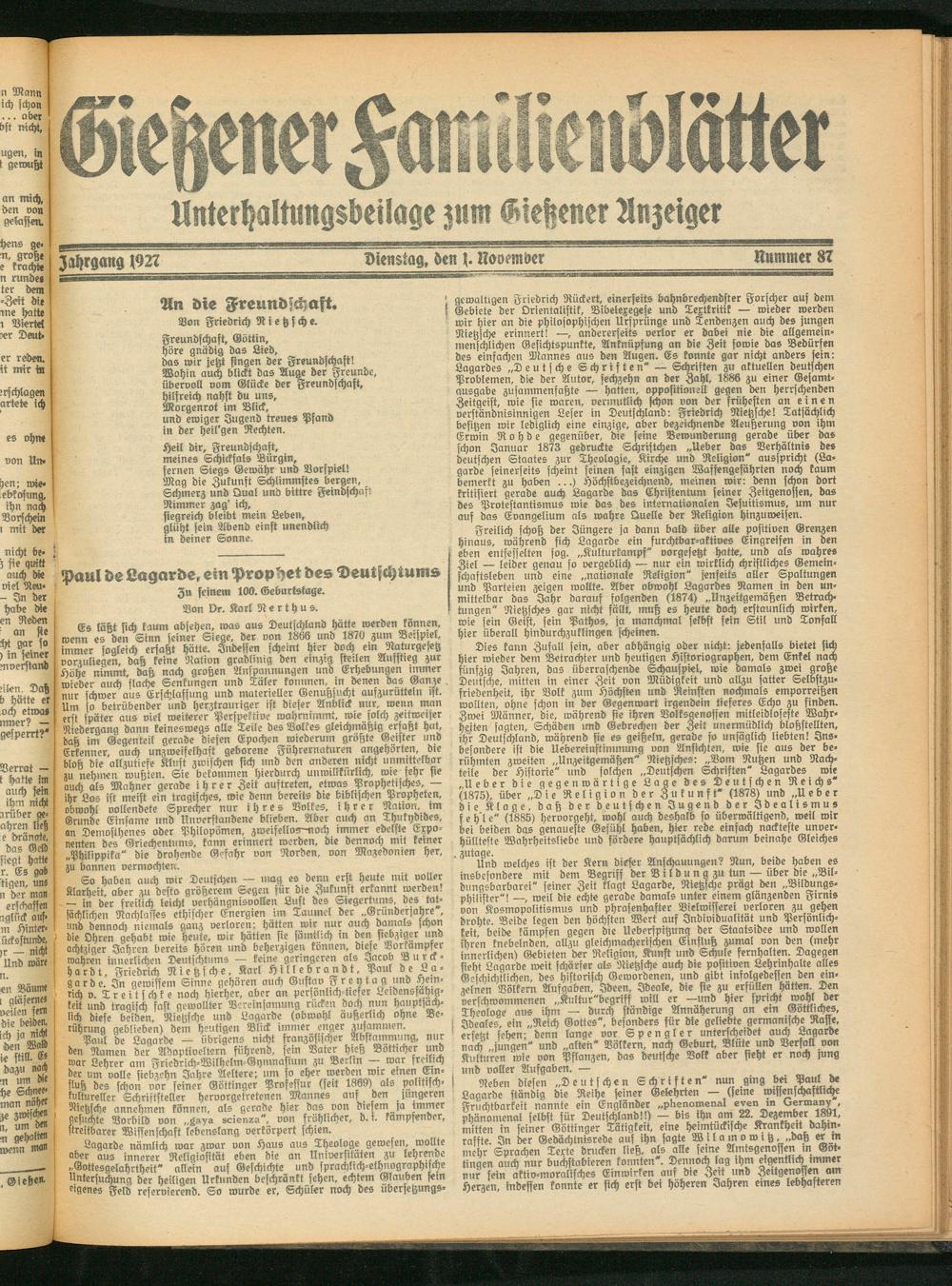 Freilich schoß der Jüngere ja dann bald über alle positiven Grenzen hinaus, während sich Lagarde ein furchtbar-aktives Eingreifen in den eben entfesselten sog. „Kulturkampf" vorgesetzt hatte, und als wahres Ziel — leider genau so vergeblich — nur ein wirklich christliches Gemeinschaftsleben und eine „nationale Religion" jenseits aller Spaltungen und Parteien zeigen wollte. Aber obwohl Lagardes Namen in den unmittelbar das Jahr darauf folgenden (1874) „Unzeitgemäßen Betrachtungen" Nietzsches gar nicht fällt, muß es heute doch erstaunlich wirken, wie sein Geist, fein Pathos, ja manchmal selbst sein Stil und Tonfall hier überall hindurchzuklingen scheinen.