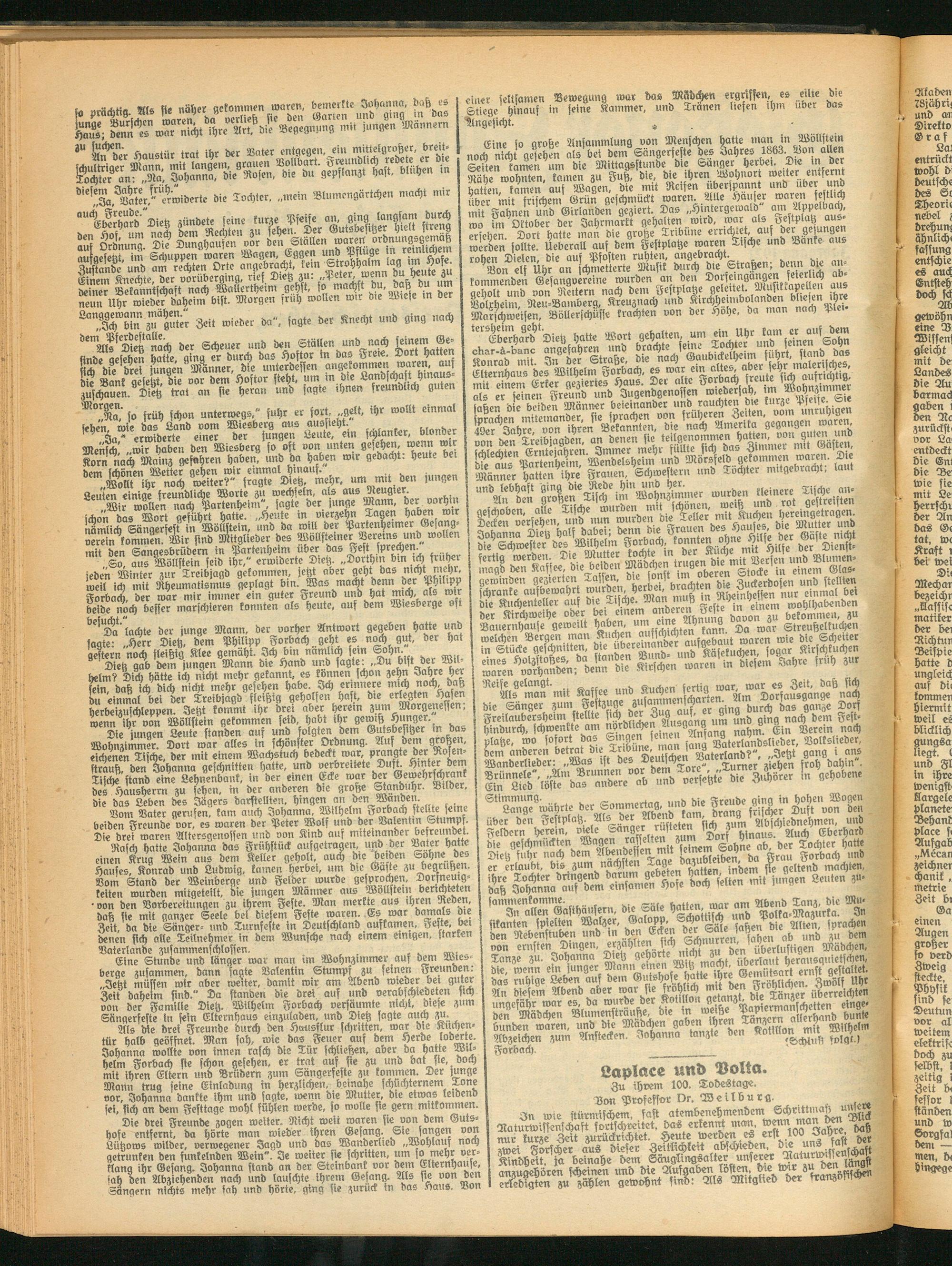 Als die drei Freunde durch den Hausflur schritten, war die Kuchentür halb geöffnet. Man sah, wie das Feuer auf dem Herde loderte. Johanna wollte von innen rasch die Tür schließen, aber da hatte Wilhelm Forbach sie schon gesehen, er trat auf sie zu und bat sie,, doch mit ihren Eltern uub Brüdern zum Sängerfeste zu kommen. Der junge Mann trug seine Einladung in herzlichen, beinahe schüchternem Tone vor, Johanna dankte ihm und sagte, wenn die Mutter, die etwas leidend sei, sich an dem Festtage wohl fühlen werde, so wolle sie gern mitkommen.