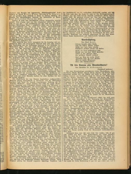 Aebrigens kann man sich and) leicht klar machen, datz «S gar nicht anders sein kann. Wer beispielsweise auf einem Karussell fährt, der wird die in seinem Mittelpunkt stehende, das Dach tragende Achse über den Hintergrund wandern sehen; auch wenn wir um einen fteistehenden Baum herumgehen, verdeckt der Daum dabei die verschiedensten Teile der Landschaft. Freilich, wenn wir Karussell fahren oder um einen Daum herumgehen, so wiffen wir dies sehr Wohl, während wir vom Amlauf der Erde um die Sonn« unmittelbar gar nichts merken und uns daher täuschen laffen. Damit der Vergleich mit dem Karussell einigermaßen zutrisst, müssen wir freilich annehmen, daß die Landschaft, di« bei diesem Vergleich an di« Stelle des Fixsternhimmels tritt, ganz ungeheuer weit entfernt ist Der nächstgelegene Fixstern ist etwa l/4 Million mal weiter entfernt als der Halbmesser der Erde Beträgt. Wir müßten uns also etwa denken, daß ganz Deutschland völlig leer sei und erst außerhalb unseres Vaterlandes die „Landschaft" begänne, In deren Mitte wir uns beim Fahren bewegen. Daß wir uns beim Amlauf einigen Punkten der Landschaft nähern, uns aber von andern entfernen, das macht bei dieser Entfernung so gut wie gar nichts aus. und so