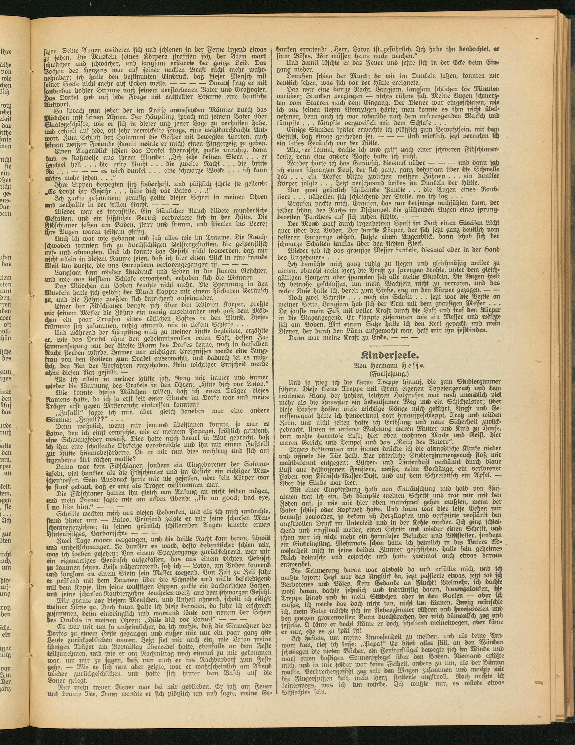 Mir graut« vor diesem Menschen, und Unheil ahnend, schritt ich eiligst meiner Hütte zu. Doch kaum hatte ich diese betreten, da fuhr ich erschreckt zusammen, denn eindringlich und warnend tönte non ^neuern der Schrei Bes Orakels in meinen Ohren: „Hüte dich vor Latoo!" •--— —