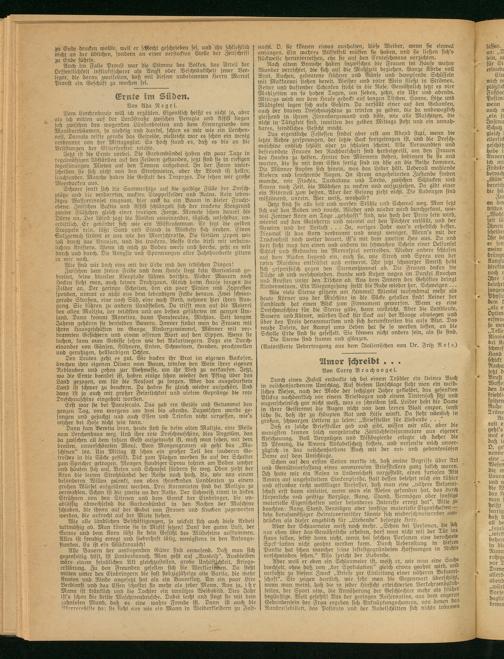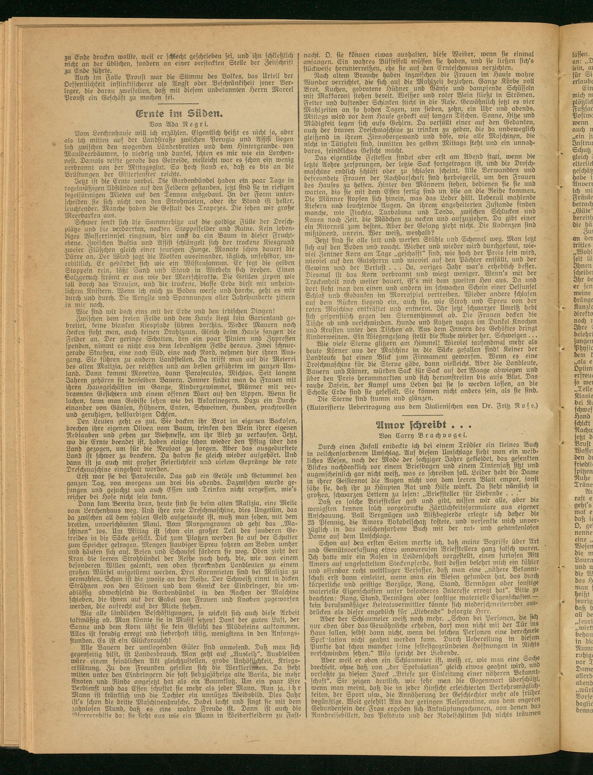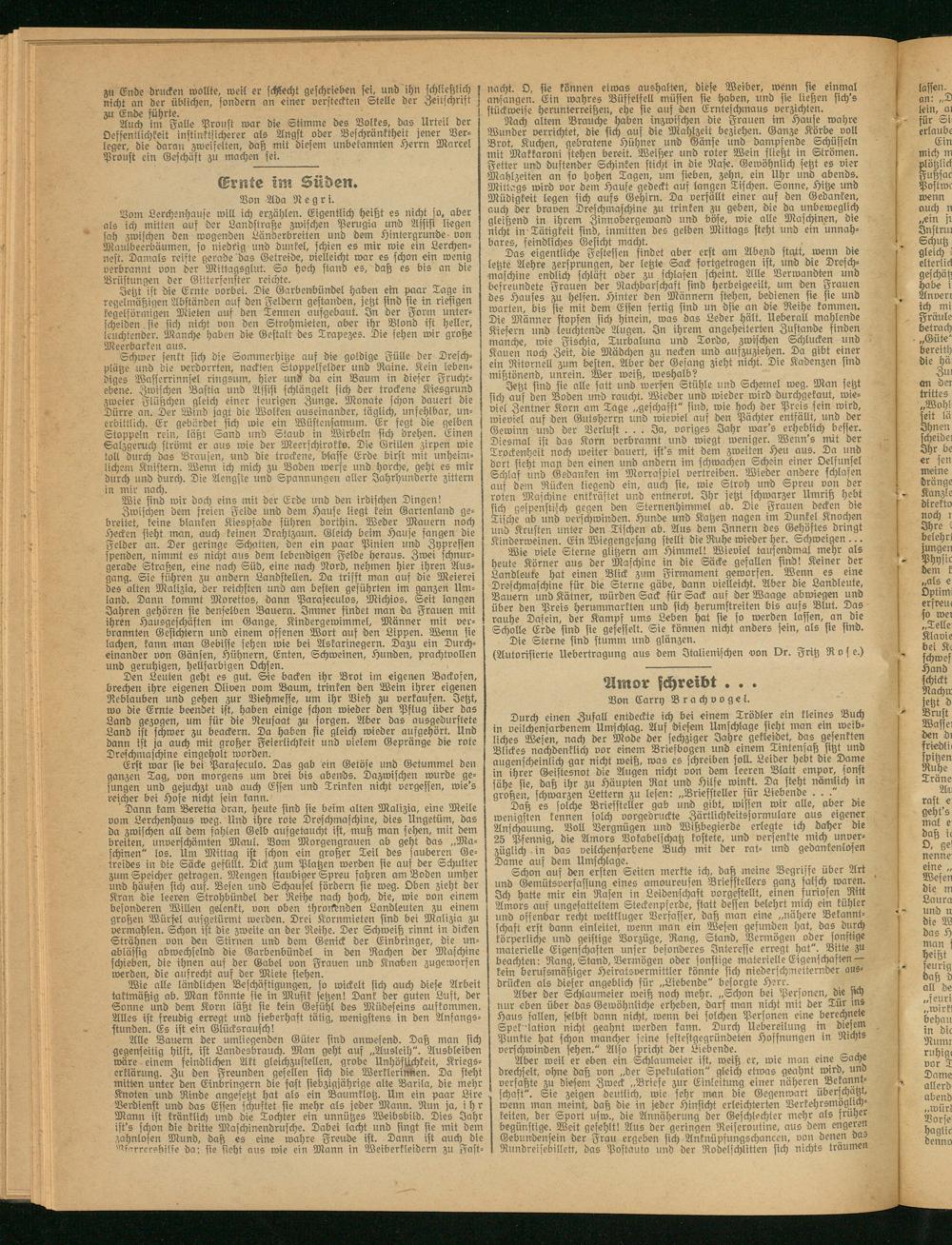 Nach altem Branche haben inzwischen die Frauen im Hause wahre Wunder verrichtet, die sich auf die Mahlzeit beziehen. Ganze Körbe voll Brot, Kuchen, gebratene Hühner und Gänse und dampfende Schüsseln mit Makkaroni stehen bereit. Weißer und roter Wein fließt in Strömen. Fetter und duftender Schinken sticht in die Nase. Gewöhnlich setzt es vier Mahlzeiten an so hohen Tagen, um sieben, zehn, ein Uhr und abends. Mittags wird vor dem Haufe gedeckt auf langen Tischen. Sonne, Hitze und Müdigkeit legen sich aufs Gehirn. Da verfällt einer auf den Gedanken, auch der braven Dreschmaschine zu trinken zu geben, die da unbeweglich gleißend in ihrem Zinnobergewand und böse, wie alle Maschinen, die nicht in-Tätigkeit find, inmitten des gelben Mittags steht und ein unnahbares, feindliches Gesicht macht.