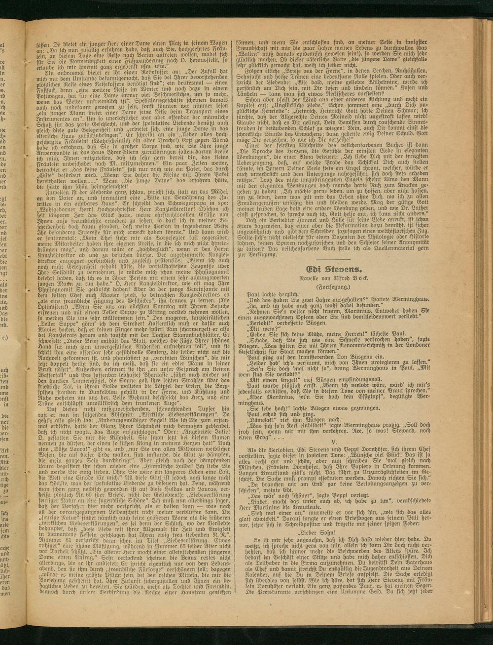 Ws die Verlobten, Edi Stevens und Peppi Dornhöfer, sich ihrem Chef vorstellten, sagte dieser in jovialem Tone: „Wünsche viel Glück! Das ist ja alles recht gut und schön, aber nun schreiben Sie 'mal gleich nach München, Fräulein Dornhöfer, daß Ihre Papiere in Ordnung kommen. Langen Brautstand gibt’s nicht. Das führt zu Unzuträ glicht eiten im Geschäft. Die Sache muß prompt efsektuiert werden. Danach richten Sie sich."