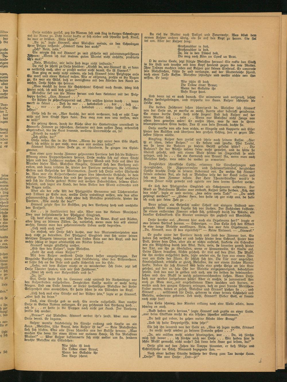 O im meine Seele, jetzt stürzte Melusine heraus! Sie reckte den Stech in die Luft und tauchte mit dem Kopf heulend gegen die tote Mutter. 3hre Tränen machten indes auf Kasper gar keinen Eindruck. Er umarmte fein Melusinchen, küßte sie und verlangt«, auf der Mutterleiche sitzend, noch einer Tasse Kaffee. Melusine schluchzte und wollte nichts von ihm wissen. Er fang: