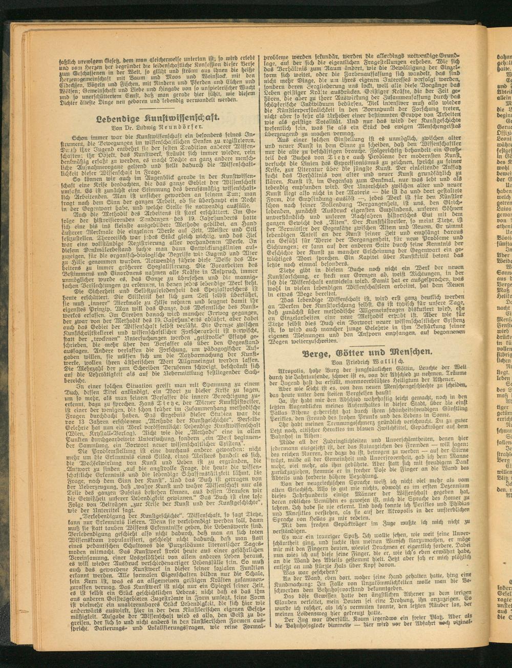 ö’n einer solchen Situation greift man mit Spannung zu einem Buch, dessen Titel ankündigt, ein Wort zu, dieser Krise zu sagen, um so mehr, als man seinem Verfasser die innere Berechtigung zu- erkennt, dazu zu sprechen. Hans Liehe, der Wiener Kunsthistoriker, ist einer der wenigen, dir schon früher im Zusammenhang methodische Fragen durchdacht haben. Das Ergebnis dieser Studien war die vor 13 Kahren erschienene „Methode der Kunstge>chich>e . Derselbe Gelehrte hat nun ein Werk veröffentlicht: Lebendige Kunstwissenichaft (Wien, Kryftall-Derlag). Vicht wie die „LNethode" eine m allen Punkten durchgearbeitete Untersuchung, sondern „ein Werk beginnender Sammlung, ein Vorwort neuer wissenschaftlicher Existenz.