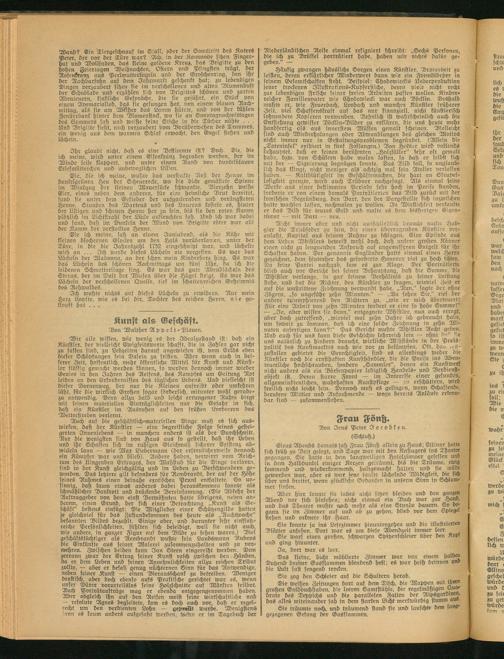 Wir alle wissen, wie wenig es der Jdealzustand ist: dah ein Künstler, der vielleicht Ewigkeitswerte schafft, die in Zahlen gar nicht zu fassen sind, zu Lebzeiten darauf angewiesen ist, vom Erlös eben dieser Schöpfungen sein Dasein zu fristen. Aber wenn auch in besserer Zeit, hoffentlich, mehr öffentliche Mittel für Kunst und Künstler flüssig gemacht werden können, so werden dennoch immer wieder Genies in den Jahren des Reifens, des Kampfes um Geltung Not leiden an den Erfordernissen des täglichen Lebens. Änd vielleicht ist dieser Dornenweg, der nur die Kleinen aufreibt oder umkehren läßt, für die wirklich Großen sogar förderlich, mitunter wohl geradezu notwendig. Senn allzu bald und leicht errungener Ruhm birgt mit seinen materiellen Einträglichkeiten nur die Gefahr in sich, dah ein Künstler im Ausruhen auf den frühen Lorbeeren das Weiterstreben verlernt.