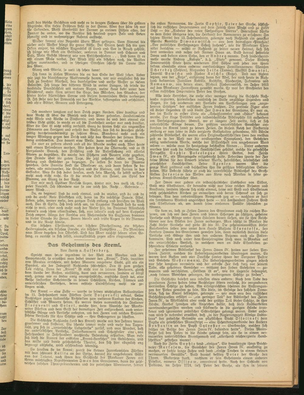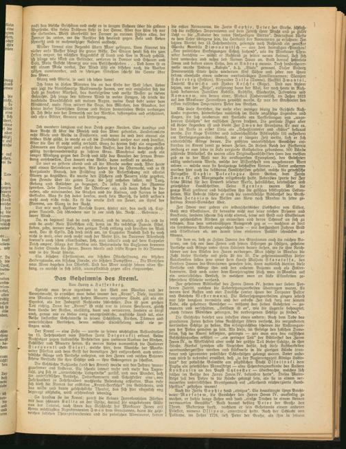 Zur geheimen Bibliothek des Zaren Iwan IV. hatten nur sieben Personen Zutritt, welchen die Uebersetzungsarbeiten übertragen waren. Cs waren drei Rusten und vier Deutsche (unter ihnen der Dorpater Pastor und Gelehrte W e ft er mann). Die Hebersetzungsarbeiten gingen jedoch nur sehr langsam vorwärts und der erboste Zar ließ kurz vor seinem Tode, alle geheimen Gemächer — mitsamt den sieben Gelehrten — zu- mauern und verschütten. „Seitdem ist es", wie die Legende behauptet, „noch keinem Menschen gelungen, die verborgenen Schätze zu finden".