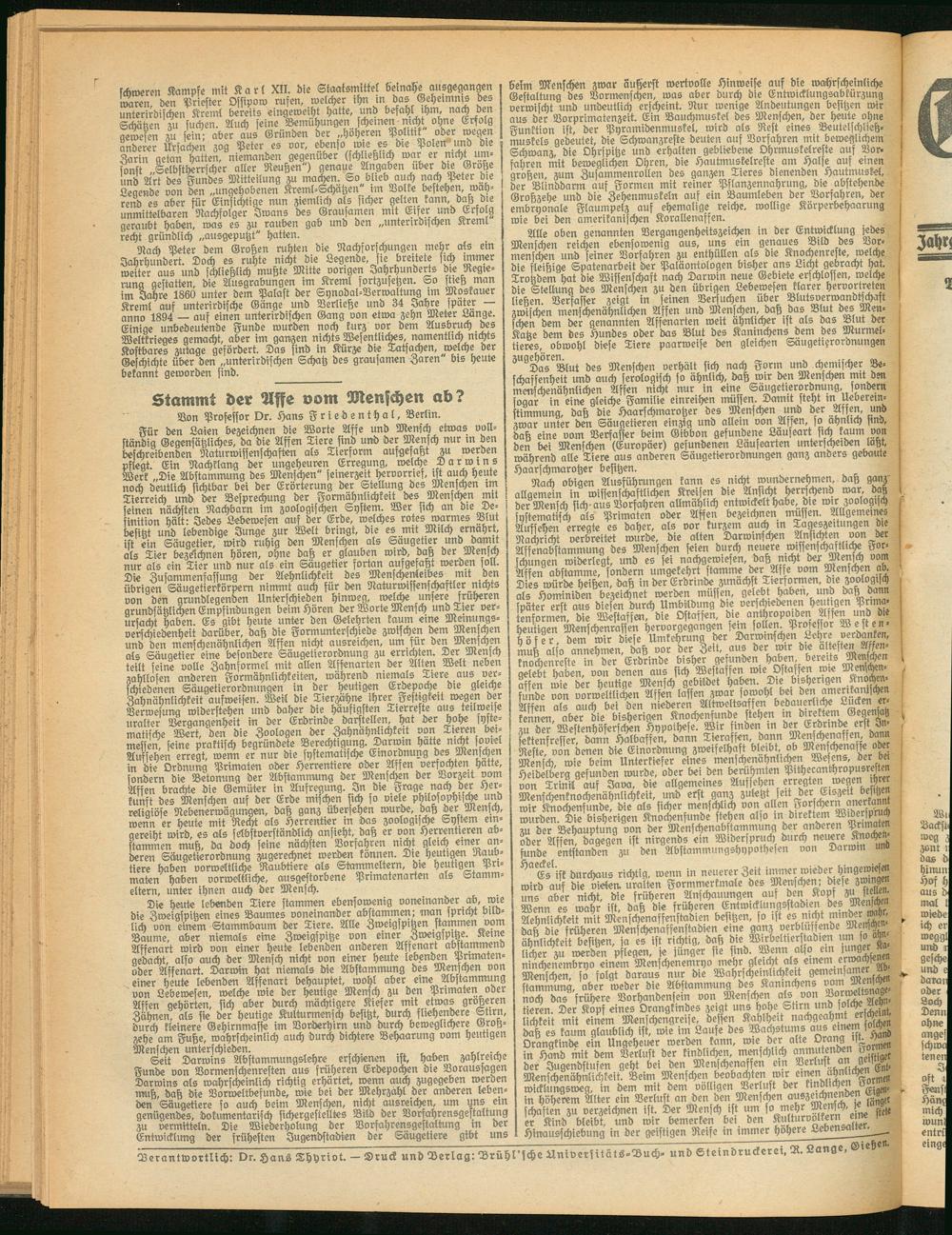 Nach obigen Aussühvungen kann es nicht wundernehmen, daß ganz allgemein in wissenschaftlichen Kreisen die Ansicht herrschend war, daß der Mensch sich aus Vorfahren allmählich entwickelt habe, die wir zoologisch systematisch als Primaten oder Affen bezeichnen müssen. Allgemeines Aufsehen erregte es daher, als vor kurzem auch m Tageszeitungen die Nachricht verbreitet wurde, die alten Darwinschen Anfichten^.von bet Affenabstammung des Menschen seien durch neuere wissenschchtliche Forschungen widerlegt, und es sei nachgewiesen, daß nicht der Men^) vom Affen abstamme, sondern umgekehrt stamme der Affe vom Menschen ab. Dies würde heißen, daß in der Erdrinde zunächst Tierformen, die zoologisch als Hominiden bezeichnet werden müssen, gelebt haben, und daß dann später erst aus diesen durch Umbildung die verschiedenen heutigen Prima- tenformen, die Westassen, die Ostaffen, die anthropoiden. Affen^unb die heutigen Menschenrassen hervorgegangen sem sollen. Professor W e st e n Höfer, dem wir diese Umkehrung der Darwinschen Lehre vetbmtm, muß also annehmen, daß vor der Zeit, aus der wir die ältesten Men knochenreste in der Erdrinde bisher gefunden, hoben, bereits Menschen gelebt haben, von denen aus sich Westaffen wie Ostaffen wie Menschenaffen wie der heutige Mensch gebildet haben. Die bisherigen,Knochen- funde von vorweltlichen Affen lassen zwar sowohl bei den amerikanischen Affen als auch bei den niederen Altweltsaffen bedauerliche ducken erkennen aber die bisherigen Knochenfunde stehen m direktem Gegensatz zu der Westenhöferschen Hypothese. Wir finden in der Erdrmde! erst^^Insektenfresser, dann Halbaffen, dann Tieraffen, dann Menschenafsen, dann Reste, von denen die Einordnung zweifelhaft bleibt, ob Menschenaffeoder Mensch, wie beim Unterkiefer eines menschenähnlichen Wesens, der bei Heidelberg gefunden wurde, oder bei den berühmten Prthecanthropusresten von Trinil auf Java, die allgemeines Aufsehenerregten wegen ihrer Menschenknochenähnlichkeit, und erst ganz zuletzt seit der Ewze.t j 3 wir Knochenfunde, die als sicher menschlich vonallen Forschern anerkannt wurden. Die bisherigen Knochenfunde stehen also in direktem Widerspruch zu der Behauptung von der Menschenabstammurm der anderen Primaten oder Assen, dagegen ist nirgends ein Widerspruch durch neuere Knocheü- funde entstanden zu den Abstammungshypothesen von Darwin uno ^^Es^ist durchaus richtig, wenn in neuerer Zeit immer wieder hingewiesm wird auf die vielen- uralten Formmerkmale des Menschen: diese zwinge uns aber nicht, die früheren Anschauungen auf den Kopf zu stellen. Wenn es wahr ist, daß die früheren Entwicklungsstadien des Meistchu Aehnlichkeit mit Menschenasfenstadien besitzen, so ist e^N'chtminder^hr, daß die früheren Menschenaffenstadlen eine ganz verblüffende Mensch ähnlich!eit besitzen, ja es ist richtig, daß die Wirbeltier ad.en um s° °tzn- licher zu werden pflegen, je länger sie sind. T^nn also em lunger »a ninchenembryo einem Menschenemryo mehr gleicht als, einem, erwachst Menschen, so folgt daraus nur die Wahrscheinlichkeit gemÄnsamer M stammung, aber weder die Abstammung des Kaninchens vom Mens st noch das frühere Vorhandensein von Menschen als , von Darweltsnag tieren. Der Kopf eines Orangkindes zeigt uns hohe, Stirn und solche O lichkeit mit einem Menschengreise, dessen Kahlheit nachgeahmter daß es kaum glaublich ist, wie im Laufe des Waa,stums aus einem som Orangkinde ein Ungeheuer werden kann, wie der alte, Orangj tft # in Hand mit dem Verlust der kindlichen, menschlich anmu enden uor der Jugendstufen geht bei den Menschenaffen ein Verlust an. getztS^ Menschenähnlichkeit. Beim Menschen beobachten wir emen wicklungsweg, in dem mit dem völligen Ver ust der mdüchen F°w in höherem Älter ein Verlust an den den Menschen auszeichnenden U8 schäften zu verzeichnen ist. Der Mensch ist um so mehr Mensch, I ,fet( er Kind bleibt, und wir bemerken bei, den Kulturvölkern em