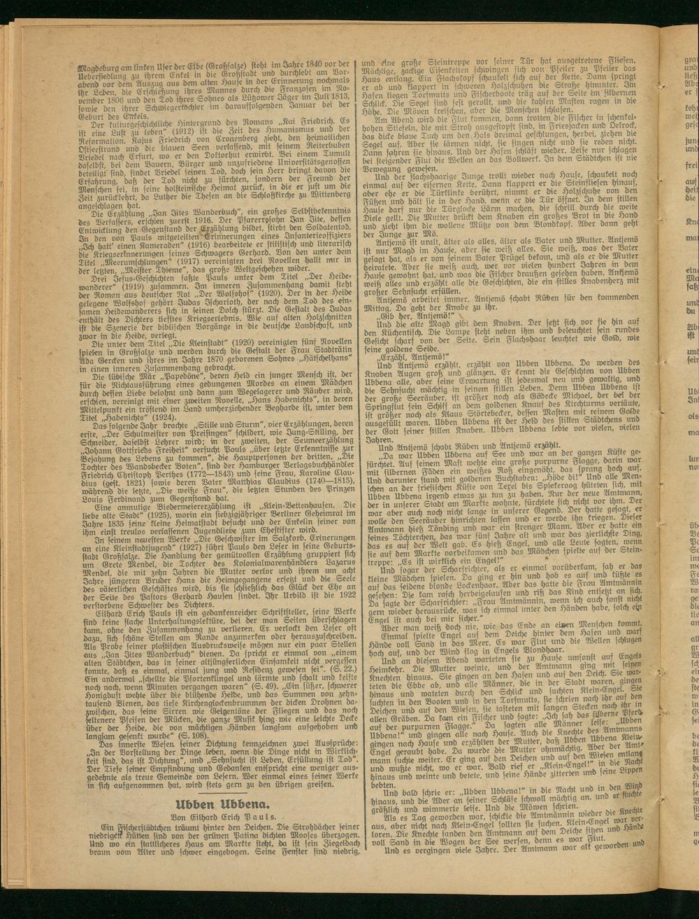 Die lübische Mär „Papeböne", deren Held em junger Mensch ist, ber für die Nichtausführung eines gedungenen Mordes an einem Mädchen durch dessen Liebe belohnt und bann zum Wegelagerer unb Räuber wird, erschien, vereinigt mit einer zweiten Novelle, „Hans Habenichts , in deren Mittelpunkt ein tröstend im Land umherzichender Beg-Harde ist, unter dem Titel Habenichts" (1924). .