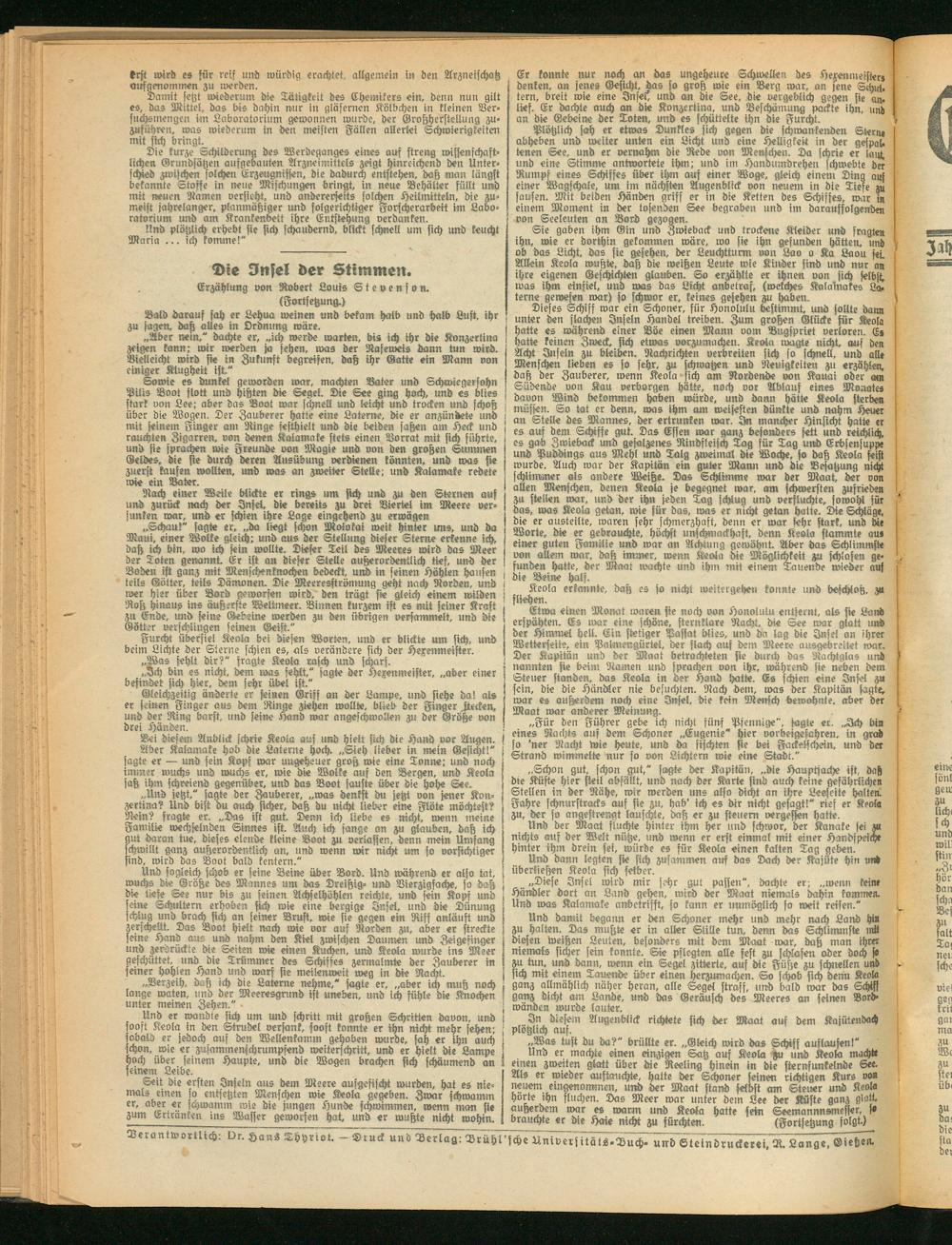 Verantwortlich; vr. Hans Thyriot. - Druck und Verlag; Drühl’sche Universitäts.Duch. unb Steindruckerei, D. Lange, Gießen.