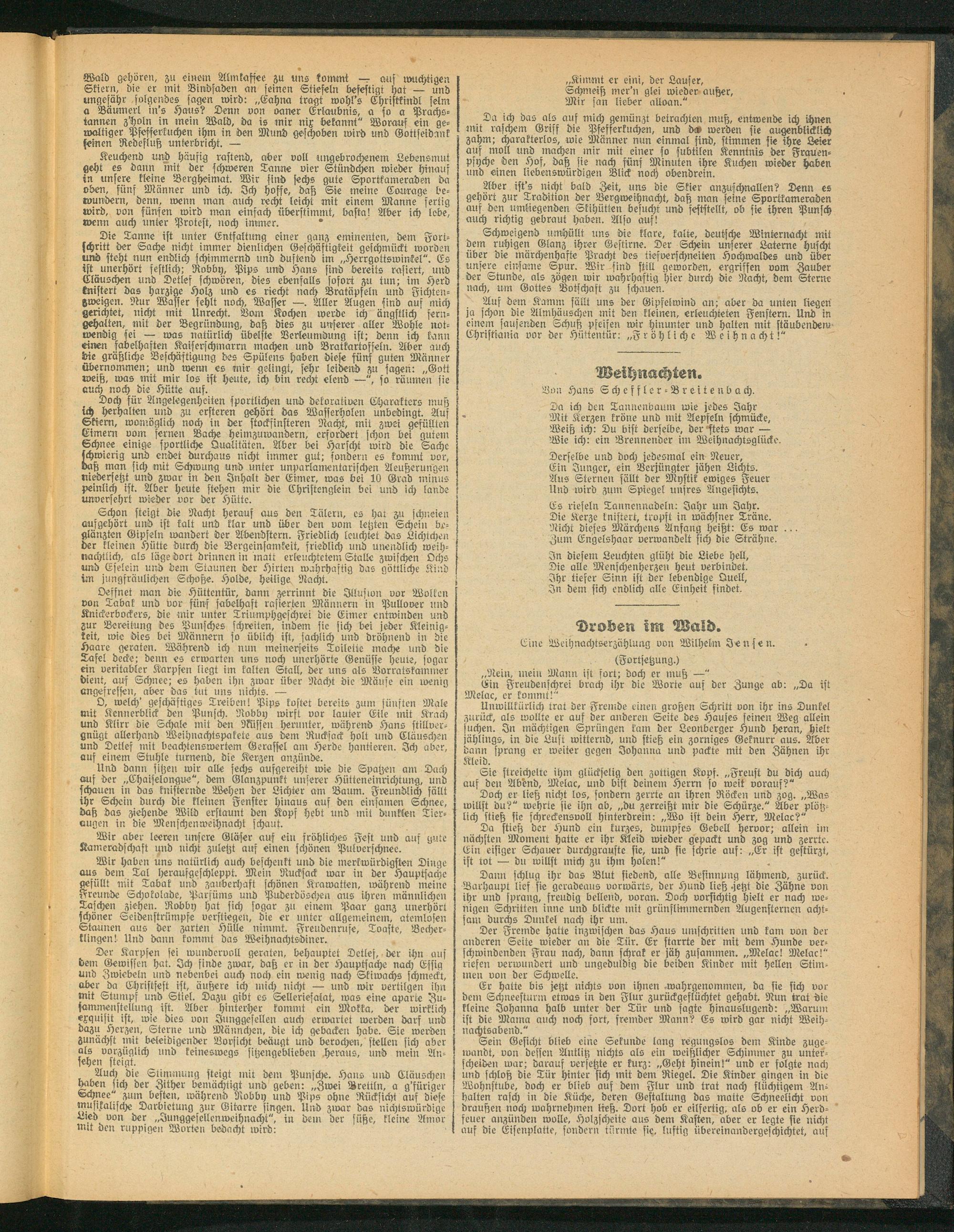 Schweigend umhüllt uns die klare, kalte, deutsche Winternacht mit dem ruhigen Glanz ihrer Gestirne. Der Schein unserer Laterne huscht über die märchenhafte Pracht des tiefverschneiten Hochwaldes und über unsere einsame Spur. Wir sind still geworden, ergriffen vom Zauber der Stunde, als zögen wir wahrhaftig hier durch die Nacht, dem Sterne nach, um Gottes Botschaft zu schauen.