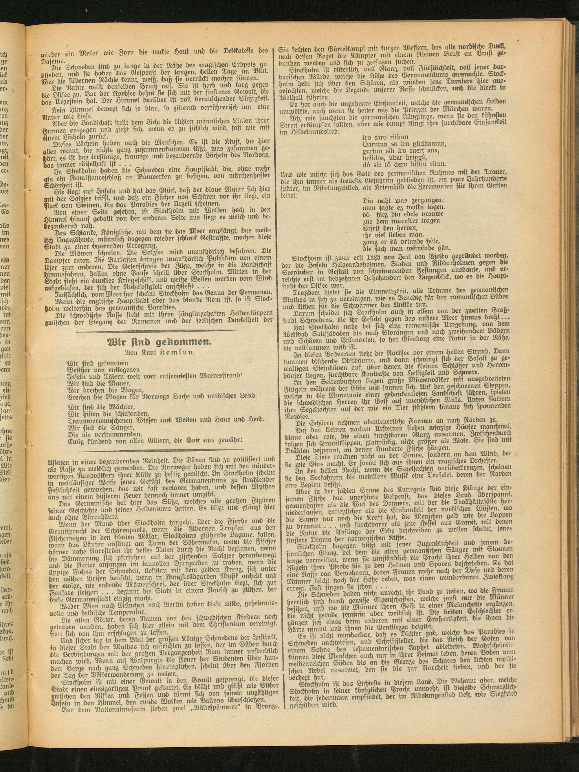 Stockholm ist ritterlich, voll Glanz, voll Fürstlichkeit, voll jener barbarischen Würde, welche die Höhe des Germanentums ausmachte. Stockholm hebt sich über den Schären, als würden jene Turniere hier ausgefochten, welche die Legende unserer Rasse schmücken, und die direkt in Walhall führten. ... ,