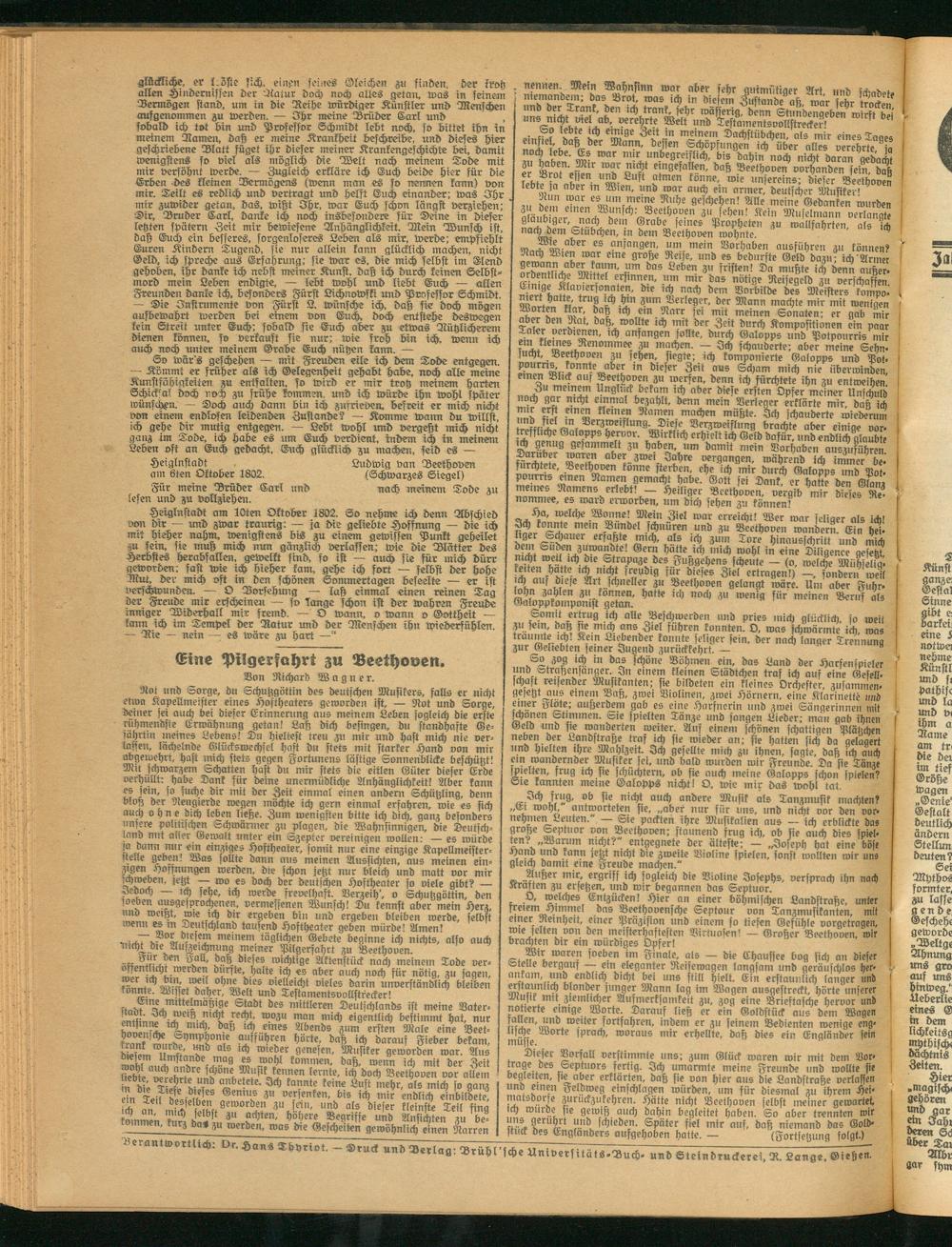 mc,n schnüren und zu Beethoven wanderii. Ein hei- liger Schauer erfaßte mich, als ich zum Tore hinausschritt und mich dem Süden zuwandte! Gern hätte ich mich wohl in eine Diligence gesetzt Strapazedes Fußgehens scheute — (o, welche Mühselig leiten hatte ich nicht ireybtg für dieses Ziel ertragen!) —, sondern weil ml aUf «e,e schneller zu Beethoven gelangt wäre. Um aber Fuhr- lotjn zahlen 3« können, hatte ich noch zu wenig für meinen Beruf als Galoppkomponist getan.