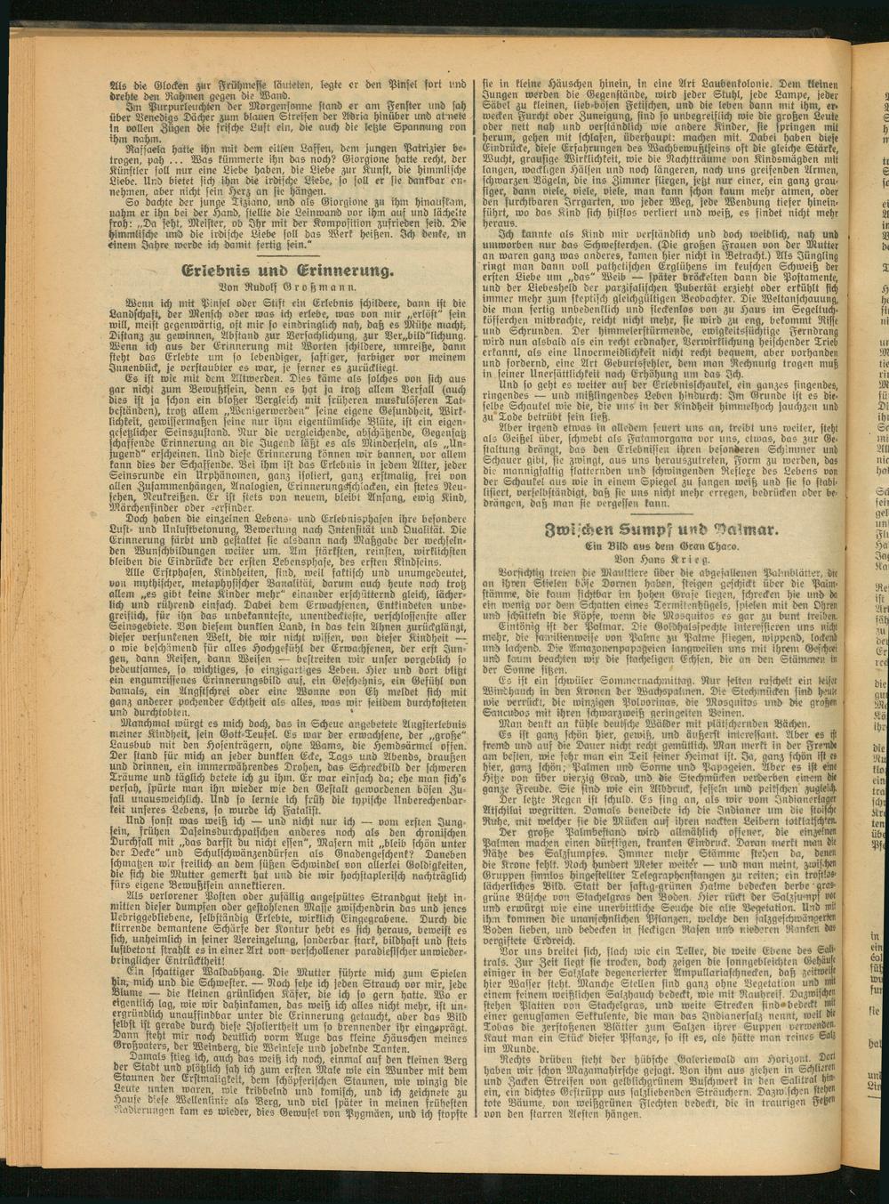 Wenn ich mit Pinsel oder Stift ein Erlebnis schildere, dann ist die Landschaft, der Mensch oder was ich erlebe, was von mir „erlöst" fein will, meist gegenwärtig, oft mir so eindringlich nah, daß es Mühe machtz Distanz zu gewinnen, Abstand zur Versachlichung, zur Ver„bild"lichung. Wenn ich aus der Erinnerung mit Worten schildere, umreiße, dann steht das Erlebte um so lebendiger, saftiger, farbiger vor meinem Jnnenblick, je verstaubter es war, je ferner es zurückliegt.