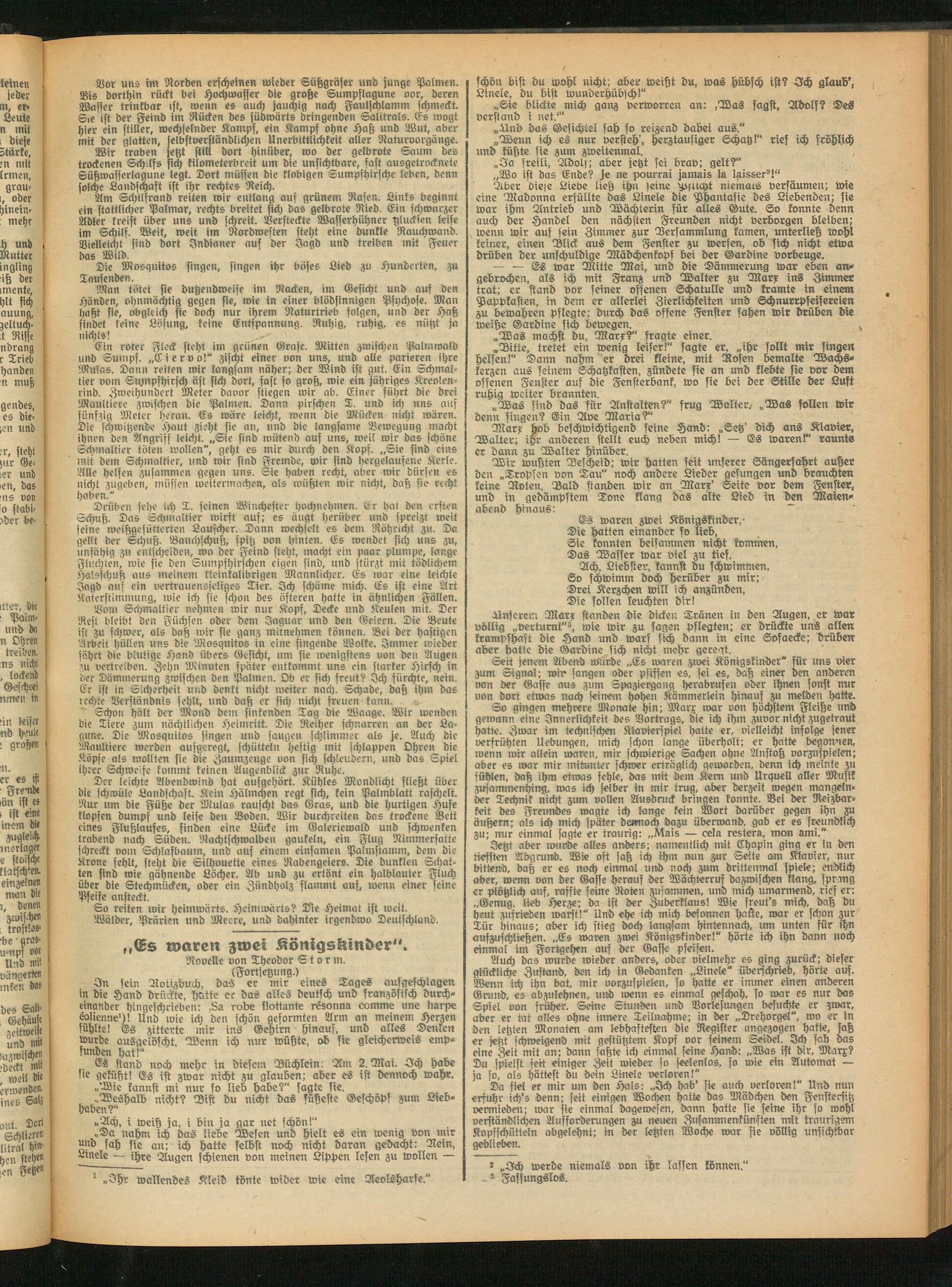 Am Schilfrand reiten wir entlang auf grünem Rasen. Links beginnt ein stattlicher Palmar, rechts breitet sich das gelbrote Ried. Ein schwarzer Adler kreist über uns und schreit. Versteckte Wasserhühner gluckten leise im Schilf. Weit, weit im Nordwesten steht eine dunkle Rauchwand. Vielleicht sind dort Indianer auf der Jagd und treiben mit Feuer das Wild.