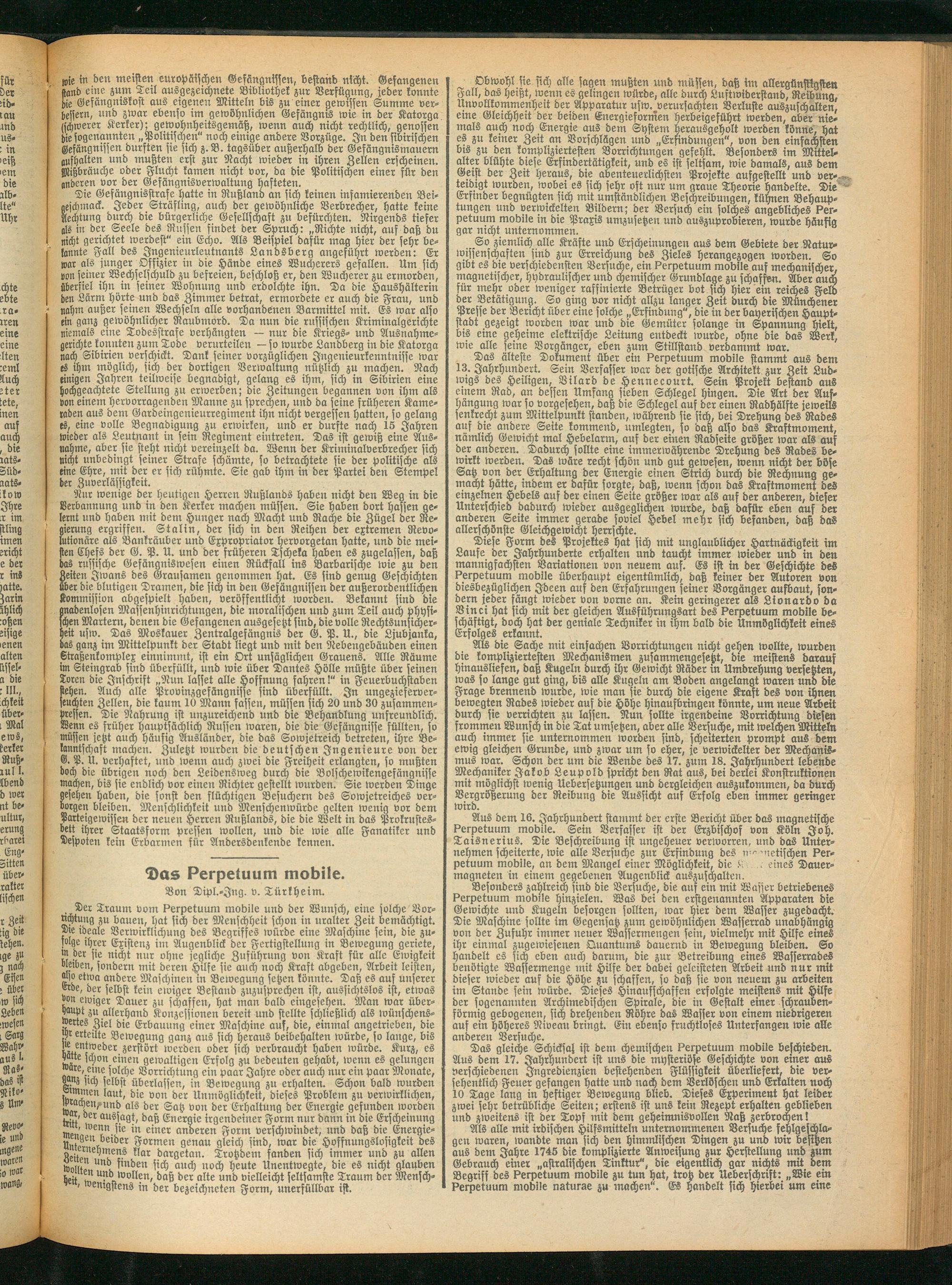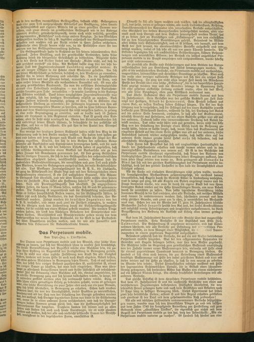 So ziemlich alle Kräfte und Erscheinungen aus dem Gebiete der Natur- Wissenschaften sind zur Erreichung des Zieles herangezogen worden. So gibt es die verschiedensten Versuche, ein Perpetuum mobile auf mechanischer, magnetischer, hydraulischer und chemischer Grundlage zu schaffen. Aber auch für mehr ober weniger raffinierte Betrüger bot sich hier ein reiches Feld der Betätigung. So ging vor nicht allzu langer Zeit durch die Münchener Presse der Bericht über eine solche „Erfindung", die in der bayerischen Hauptstadt gezeigt worden war und die Gemüter solange in Spannung hielt, bis eine geheime elektrische Leitung entdeckt wurde, ohne die das Werk, wie alle seine Vorgänger, eben zum Stillstand verdammt war.