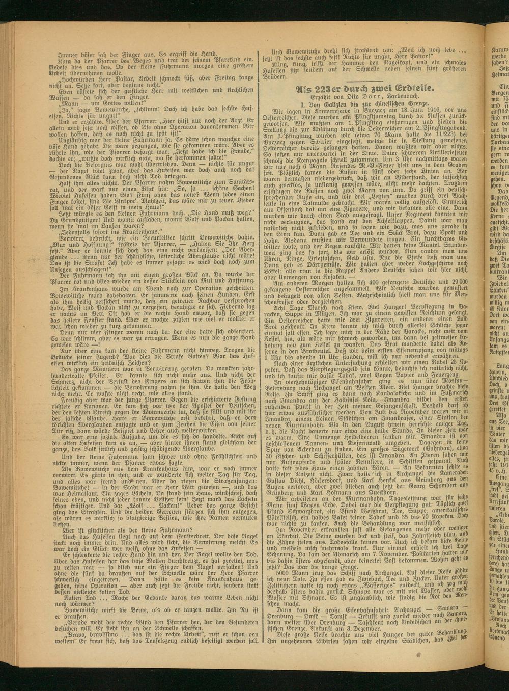 Reife. Zu Schiff ging es dann nach Kandalakscha und im Fußmarsch nach Imandra aus der Halbinsel Kola. Imandra bildet den ersten ruhenden Punkt in der Zeit meiner Gefangenschaft. Deshalb darf ich hier etwas ausführlicher werden. Von Juli bis November waren wir in Imandra, einem kleinen Städtchen am Jmandrafee, einer Station der neuen Murmanbahn. Bis in den August hinein herrschte ewiger Tag, d. h. die Nacht dauerte nur etwa eine halbe Stunde. In dieser Zeit war es warm. Eine Unmenge Heidelbeeren fanden wir. Imandra ist von geschlossenem Tannen- und Kiefernwald umgeben. Dagegen ist keine Spur von Ackerbau zu finden. Ein großes Sägewerk (Bahnbau), etwa 30 Fischer- und Schifferhütten, das ist Imandra. An gieren sahen wir nur Russenpferde und später Renntiere, in Schlitten gespannt. Auch hatte fast jedes Haus einen zahmen Bären. — An Bekannten fehlte es in dieser Notzeit nicht. Zwar hatte' ich in Archangel die Kameraden Gustav Diehl, Höckersdorf, und Karl Henkel aus Grünberg aus den Augen verloren, aber zwei blieben auch jetzt da: Georg Schombert aus Grünberg und Karl Hofmann aus Queckborn. „