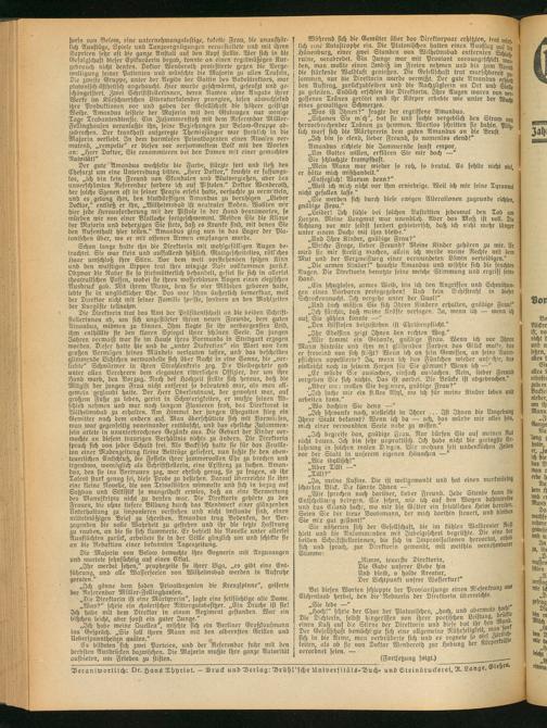 „Mir kommt ein Gedanke, gnädige Frau. Wenn ich vor Ihren Mann hinträte und ihm mit glühenden Farben das Glück malle, das er frevelnd von sich stößt? Wenn ich an sein Gewissen, an seine Vater- pflichten appellierte? Ja, wenn ich das Fünkchen wieder anftchte, das vielleicht noch in feinem Herzen für Sie glimmt? Wenn ich —"
