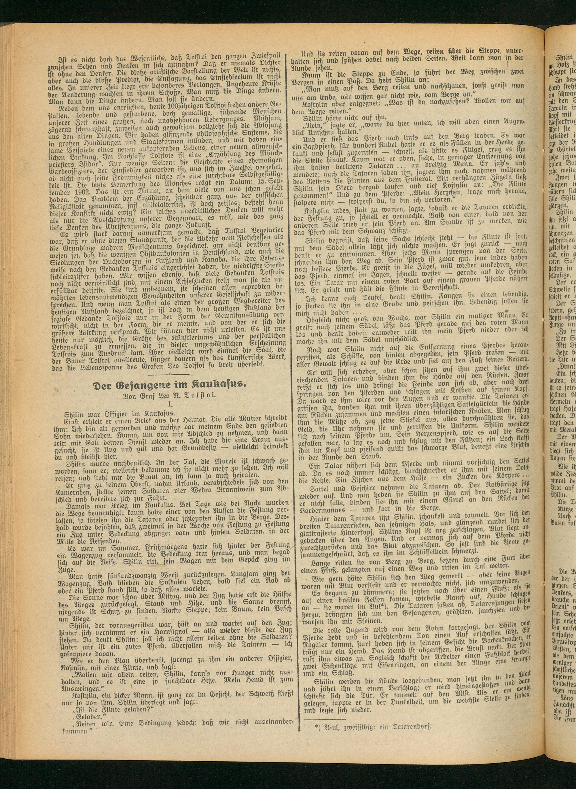 auf einen breiten Felsen kamen, wirbelte Rauch auf, Hunde » an - sie waren im Aul*). Die Tataren sahen ab, Zatarenjungen^ herzu, drängten sich um den Gefangenen, grohlten, , chz