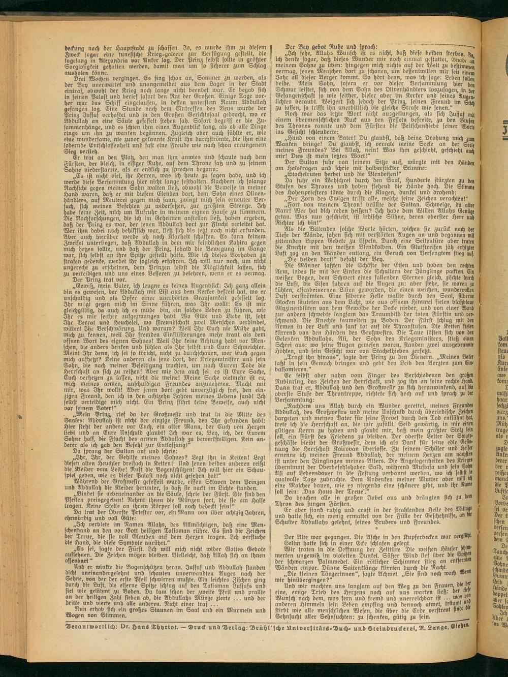 „Mein Prinz, rief da der Großwesir und trat in die Mitte des j Saales: Abdullah ist nicht der einzige Freund, den Ihr gefunden habt: i Hier steht der andere vor Euch, ein alter Mann, der Euch von Herzen liebt und an Eure Unschuld glaubt! Ich war es, Bey, ich, der Eurem Sohne half, die Flucht des armen Abdullah zu bewerkstelligen. Kein anderer als ich gab den Befehl zur Entlassung!"