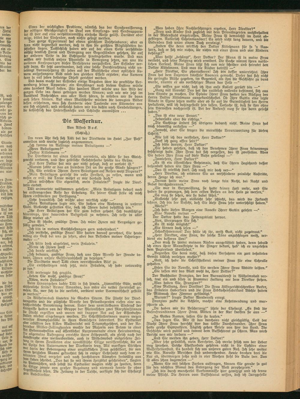Und dann macht der Erfinder einige Angaben über die praktische Verwendung seiner Apparate; ein Empfänger nach diesem System würde etwa hundert Mark kosten. Für hundert Mark würde uns das Bild der ganzen Erde ins Haus getragen werden können; und wie wir jetzt im Rundfunk Nachrichten aus aller Welt hören, so würden wir sie dann auch sehen können. Auf einer Mattscheibe würden die bewegten Bilder helfen erscheinen, was sich Hunderte oder Tausende von Kilometer von uns sich abspielt; und vielleicht haben wir bis dahin auch Sendeleitungen, die tatsächlich das Interessanteste und Schönste auswählen ...
