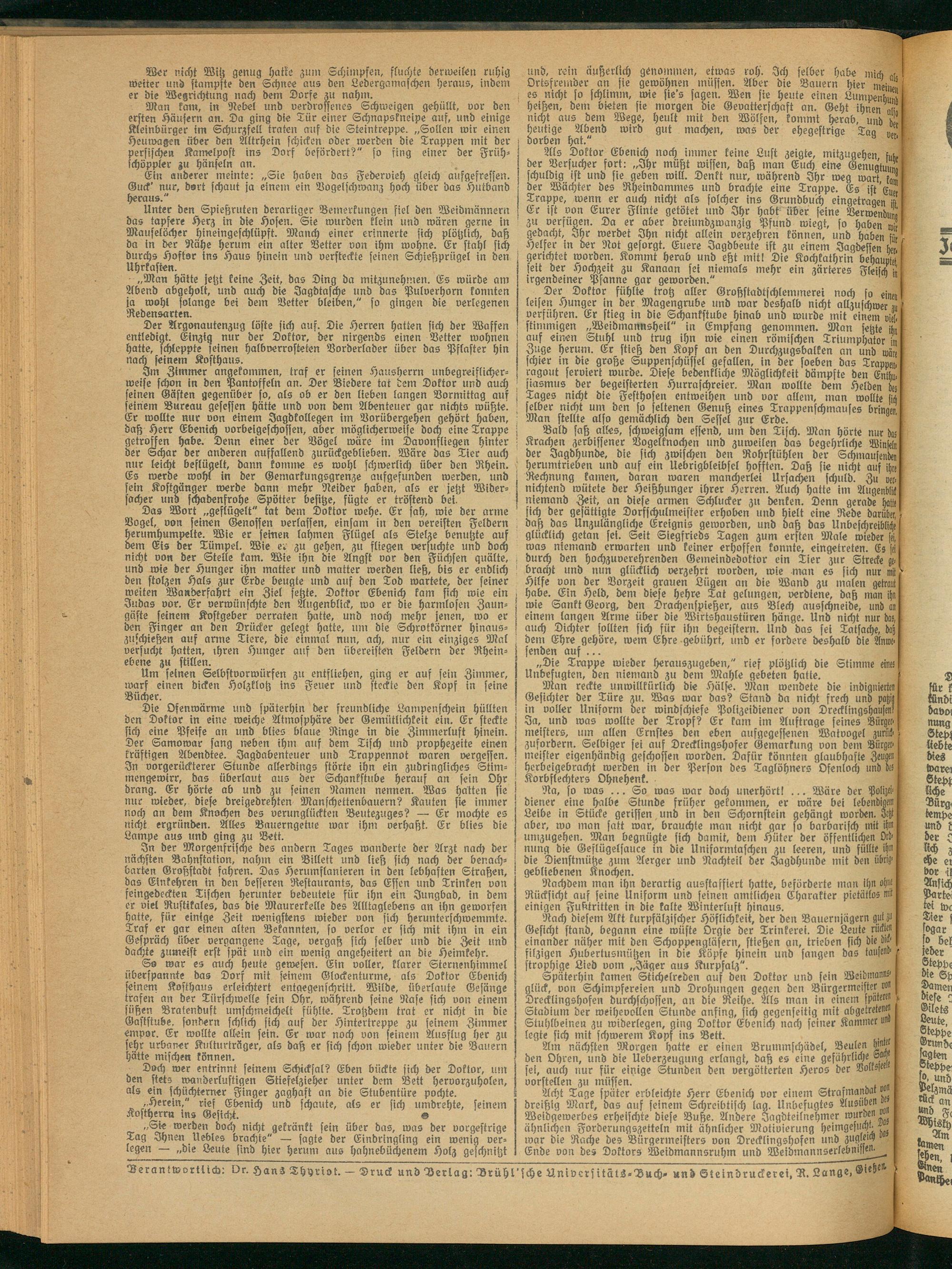 Im Zimmer angekommen, traf er seinen Hausherrn unbegreiflicherweise schon in den Pantoffeln an. Der Biedere tat dem Doktor und auch seinen Gästen gegenüber so, als ob er den lieben langen Vormittag auf i seinem Bureau gesessen hätte und von dem Abenteuer gar nichts wüßte. Er wollte nur von einem Jagdkollegen im Vorllbergehen gehört haben, daß Herr Ebenich vorbeigeschossen, aber möglicherweise doch eine Trappe getroffen habe. Denn einer der Vögel wäre hu Davonfliegen hinter der Schar der anderen auffallend zurückgeblieben. Wäre das Tier auch nur leicht beflügelt, dann komme es wohl schwerlich über den Rhein. Cs werde wohl in der Gemarkungsgrenze aufgefunden werden, und . fein Kostgänger werde dann mehr Neider haben, als er jetzt Wider- = facher und schadenfrohe Spötter besitze, fügte er tröstend bei.
