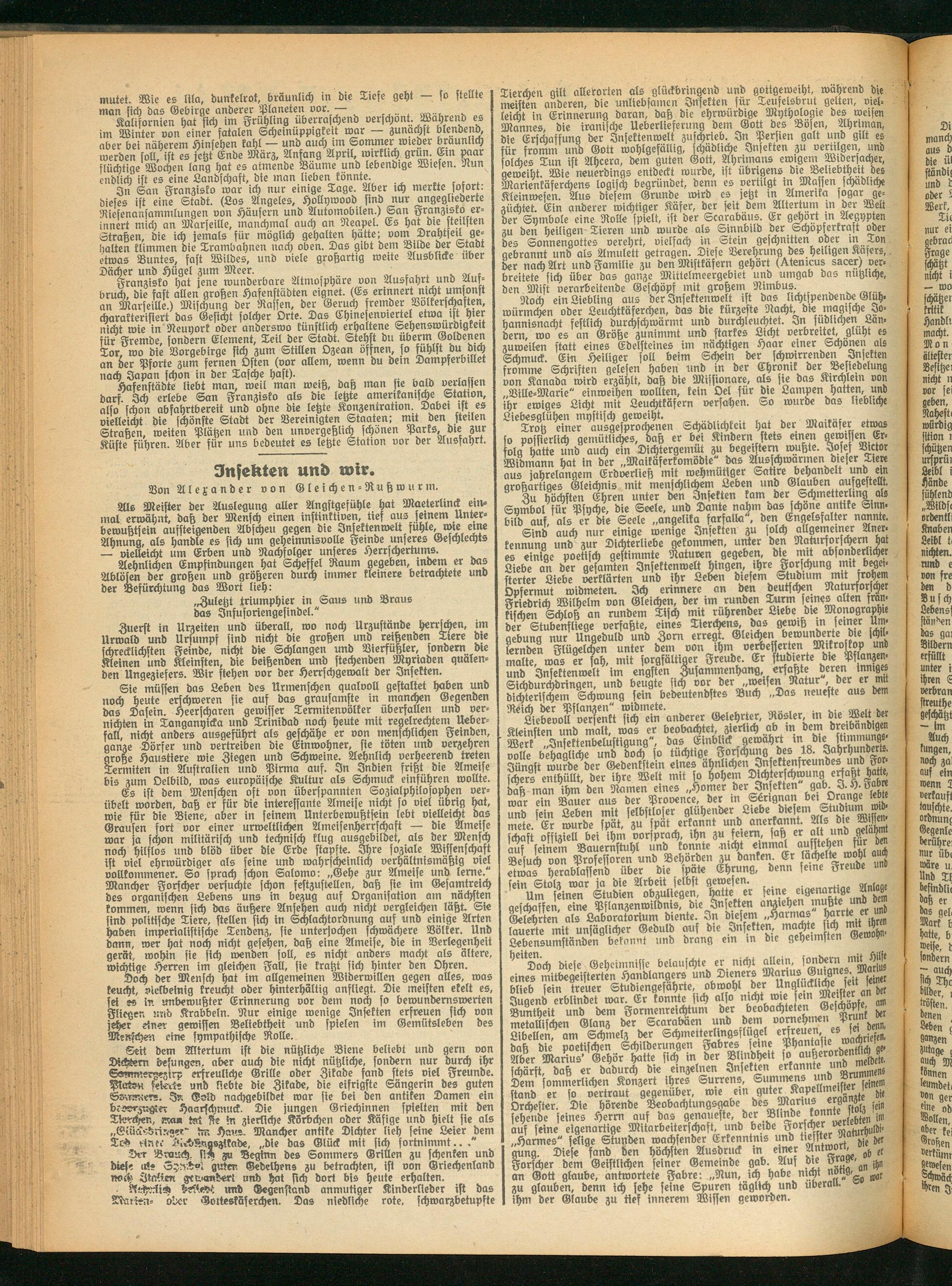 Als Meister der Auslegung aller Angstgefühle hat Maeterlinck einmal erwähnt, daß der Menfch einen instinktiven, tief aus seinem Unter« bewutztsein aussteigenden Abscheu gegen die Jnsektenwelt suhle, wie eine Ahnung, als handle es sich um geheimnisvolle Feinde unseres Geschlechts — vielleicht um Erben und Nachfolger unseres Herrschertums.