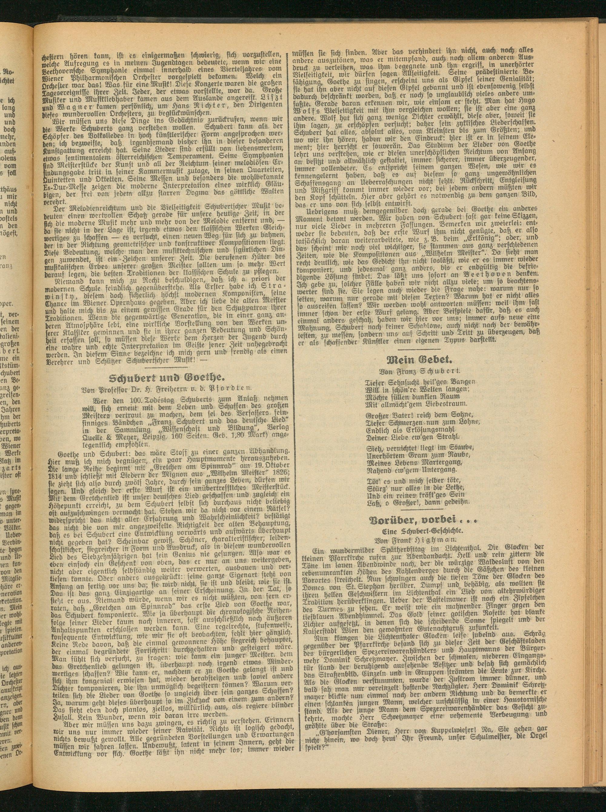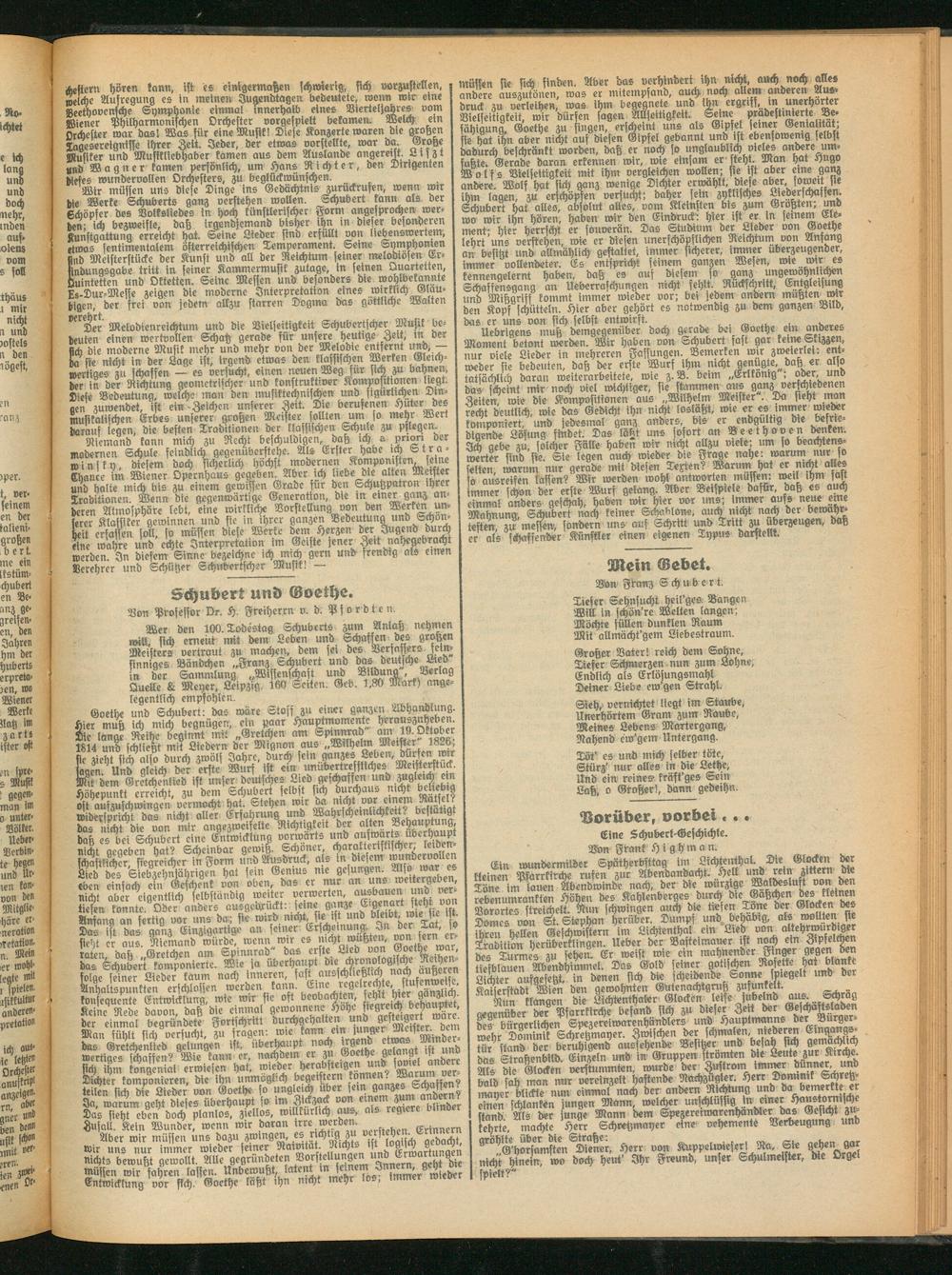 Wer den 100. Todestag Schuberts zum Anlaß nehmen will, sich erneut mit dem Leben und Schassen des großen Meisters vertraut zu machen, dem sei des Versnssers feinsinniges Bändchen „Franz Schubert und dasdeucheLied in der Sammlung „Wissenschaft und Bildung , Berlag Quelle & Meyer, Leipzig. 160 Seiten. Geb. 1,80 Mark) angelegentlich empfohlen.