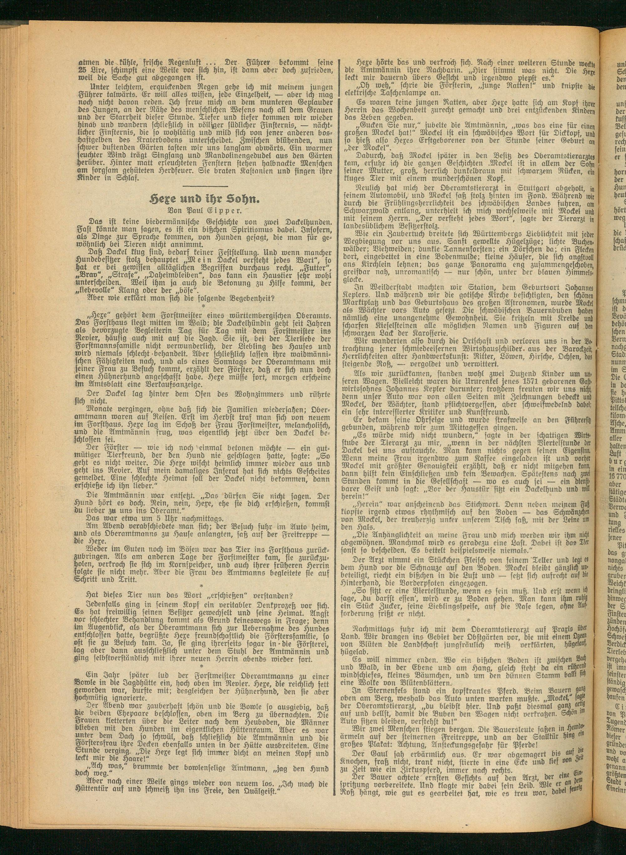 Jedenfalls ging in seinem Kopf ein veritabler Denkprozeß vor sich. Es hat freiwillig seinen Besitzer gewechselt und seine Heimat. Angst vor schlechter Behandlung kommt als Grund keineswegs in Frage; denn im Augenblick, als der Oberamtmann sich zur Uebernahme des Hundes entschlossen hatte, begrüßte Hexe freundschaftlich die Förstersfamtlie, so oft sie zu Besuch kam. Ja, sie ging ihrerseits sogar in-die Försterei, lag aber dann ausschließlich unter dem Stuhl der Amtmännin und ging selbstverständlich mit ihrer neuen Herrin abends wieder fort.