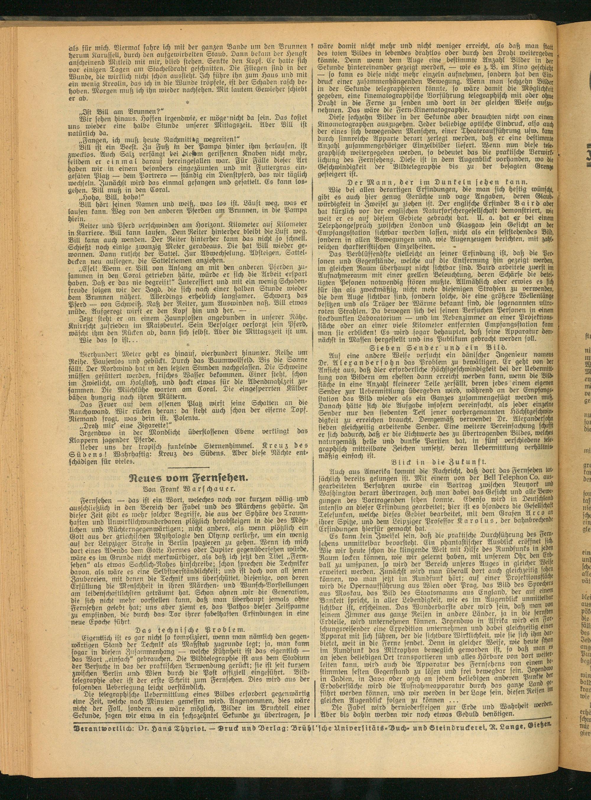 Es kann kein Zweifel sein, daß die praktische Durchführung des Fernsehens unmittelbar beoorsteht. Ein phantastischer Ausblick eröffnet Ich. Wie wir heute schon die klingend« Welt mit Hilfe des Rundfunks in MN Raum locken können, wie wir gelernt haben, mit unserem Ohr den Erdball zu nmspanen, so wird der Bereich unseres Auges in gleicher Wie erweitert werden. Zunächst wird man überall dort auch gleichzeitig scheu können, wo man jetzt im Rundstink hört; auf einer Projektionsfmche wird die Opernauffuhoung aus Wien oder Prag, das Bild des Sprechers aus Moskau, das Bild des Staatsmanns aus England, der auf einem Augenblick unmittelbuc