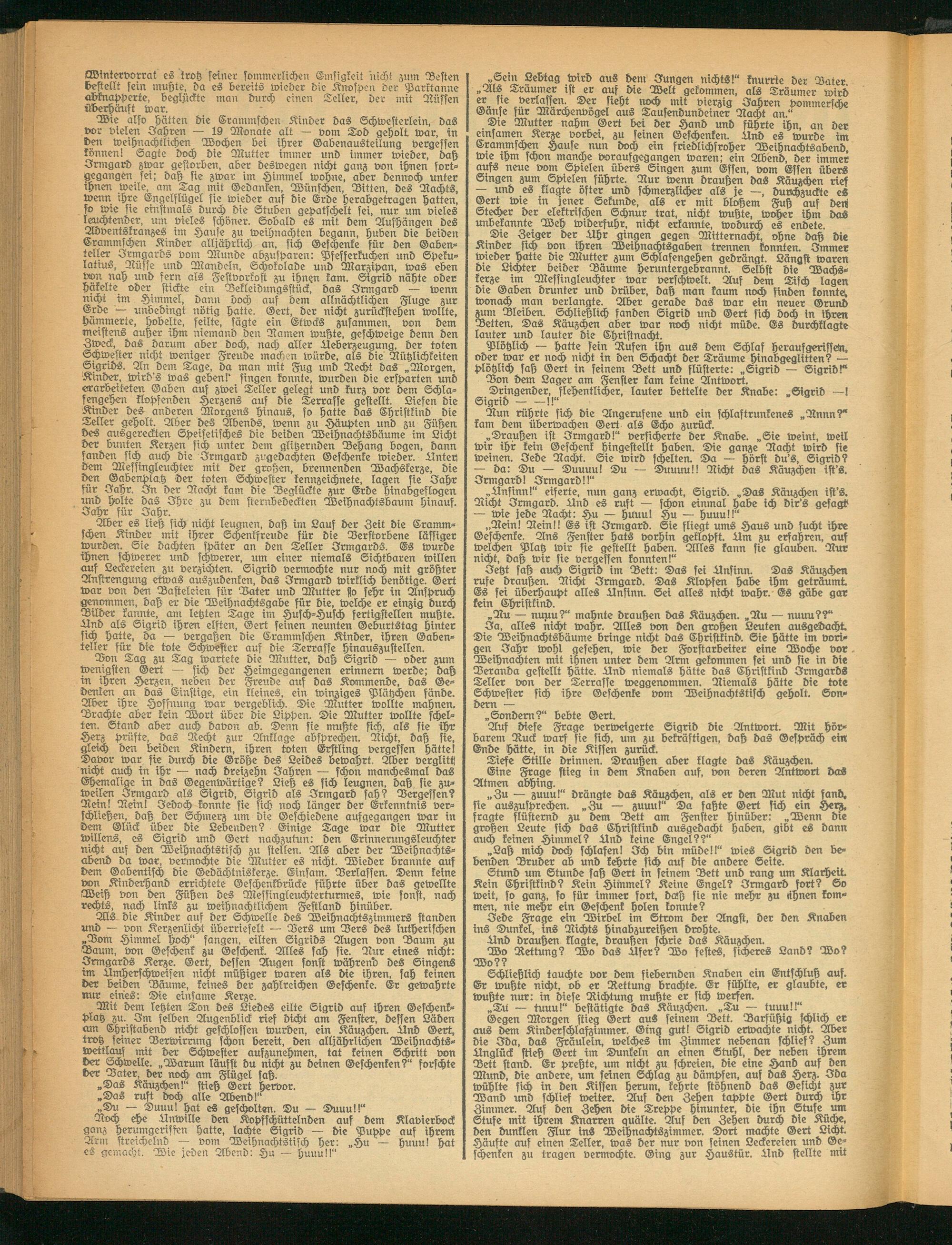 „Zu — zuuu!" drängte das Käuzchen, als er den Mut nicht fand, sie auszusprechen. „Zu — zuuu!" Da faßte Gert sich ein Herz, fragte flüsternd zu dem Bett am Fenster hinüber: „Wenn die großen Leute sich das Christkind ausgedacht haben, gibt es dann auch keinen Himmel? And keine Engel??"