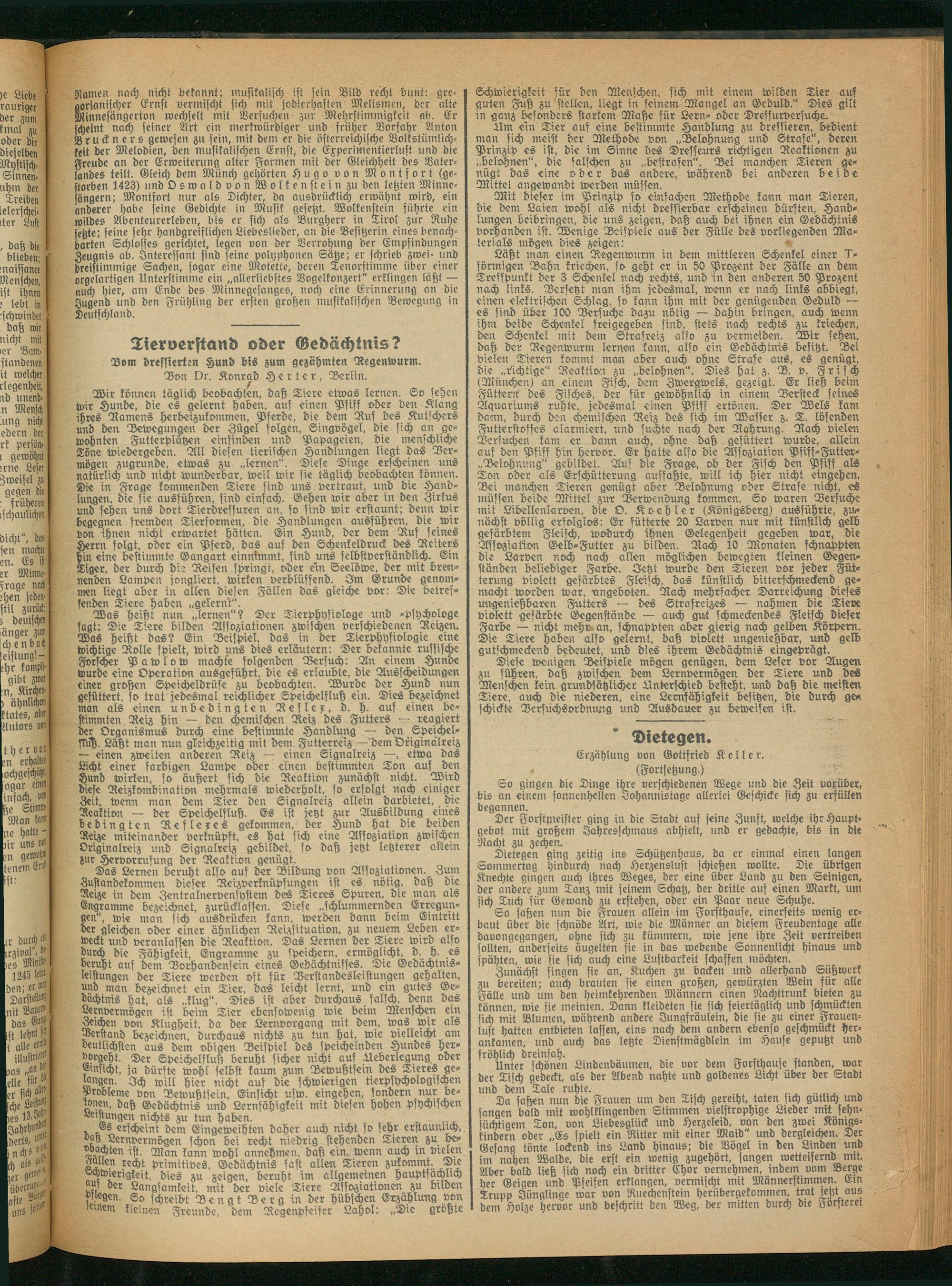 Diese wenigen Beispiele mögen genügen, dem Leser vor Qlugen zu sichren, daß zwischen dem Lernvermögen der Tiere und des Menschen kein grundsätzlicher Unterschied besteht, und dah die meisten Tiere, auch die niederen, eine Lernfähigkeit besitzen, die durch geschickte Versuchsordnung und Ausdauer zu beweisen ist.