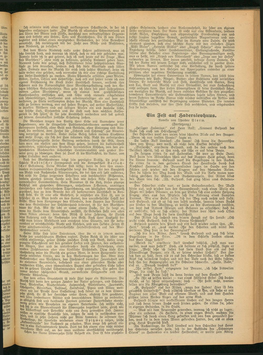 Sn kurzem ritten sie auf Haderslev. Es war zu Ende Sunt; Rolf hatte sein Mäntelchen schon auf des Rappen Hals gelegt, denn die Sonne brannte: Gaspard warf die Gugelkappe in den Nacken. Do ritten sie in dem goldenen Staub der Heerstraße durch das Kirchdorf Hammelef; die Bauernkinder lagen im Sande vor den Hütten und wiesen mit den Fingern auf den schmucken Reiter. Von da führte der Weg durch den Wald, und die Rosse traten vorsichtig zwischen die Eichen- und Buchenwurzeln. Der Ritter blies den Ottern von sich: „Ah, Gaspard, das ging schier ums Gesottenwerden!"