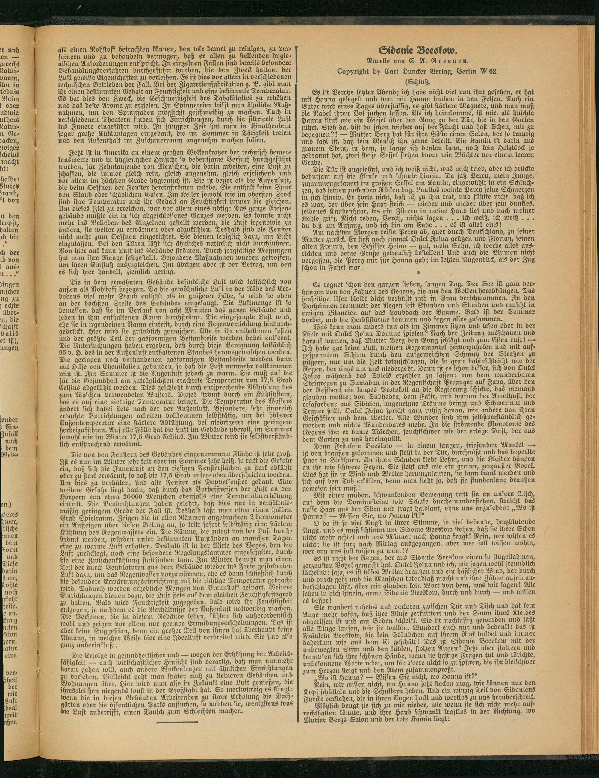 Sie wandert ruhelos und verloren zwischen Tür und Tisch und hat fein Auge mehr dafür, daß ihre Bluse zerknittert und der Saum ihres Kleides abgerissen ist und am Boden schleift. Sie ist nachlässig geworden und läßt alle Dinge laufen, wie sie wollen. Wundert euch nur und bedenkt: das ist Fräulein Beeskow, die kein Stäubchen auf ihrem Rock duldet und immer daherkam wie aus dem Ei geschält! Das ist Sidonie Beeskow mit der unbewegten Stirn und den kühlen, stolzen Augen! Jetzt aber flattern und krampfen sich ihre schönen Hände, wenn sie hastige Fragen tut und törichte, unbesonnene Worte redet, um die Leere nicht so zu spüren, die ihr bleischwer zum Herzen steigt und den Atem zusammenpreßt.