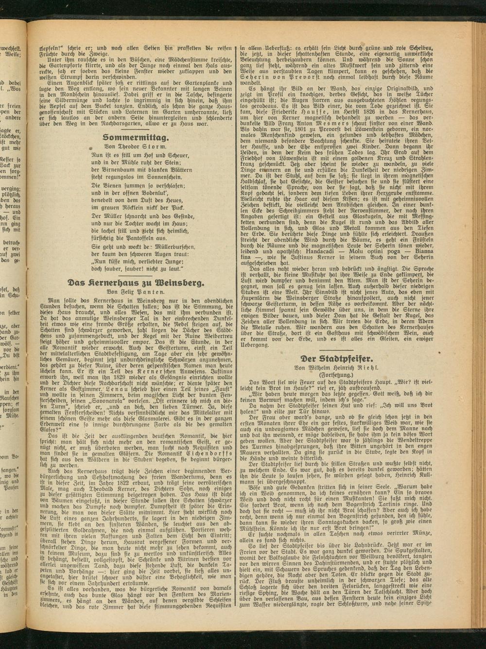 Auch das Kernerhaus trägt diese Zeichen einer beginnenden Verbürgerlichung und Seßhaftmachung des freien Wandertums, denn es ist in dieser Zeit, im Jahre 1822 erbaut, und trägt feine verräterischen Male, mag auch Theobald Kerner, des Dichters Sohn, noch einiges zu dieser gesättigten Stimmung beigetragen haben. Das Hous ist dicht von Bäumen eingefaßt, in dieser Stunde fallen ihre Schatten schwärzer und machen das Dumpfe noch dumpfer. Dumpfheit ist später die Erinnerung, die man von dieser Stätte mitnimmt. Hier steht wirklich noch die Luft eines ganzen Jahrhunderts, sie lagert in den niedrigen Zimmern, sie klebt an den finsteren Wänden, sie leuchtet aus den ab« gesplitterten Goldrahmen, die noch einmal aufglühen. Portieren wehren mit ihren vielen Raffungen und Falten dem Licht den Eintritt; überall stehen Dinge herum, Hausrat vergessener Formen und verschnörkelter Dinge, die man heute nicht mehr zu sehen bekommt, auch sn keinem Museum, dazu sind sie zu wertlos und unkünstlerisch. Alles ist behängt, bestellt, vollgestopft, die Schränke und Vitrinen bersten vor allerlei ungewissem Tand, dazu diese stehende Luft, die dunkeln Tapeten und Vorhänge —: hier ging die Zeit vorbei, sie ließ alles unangetastet, hier brütet schwer und düster eine Behaglichkeit, wie man i*e sich vor einem Jahrhundert erträumte.
