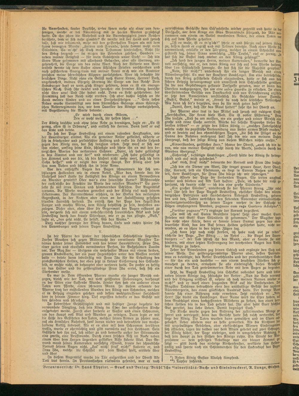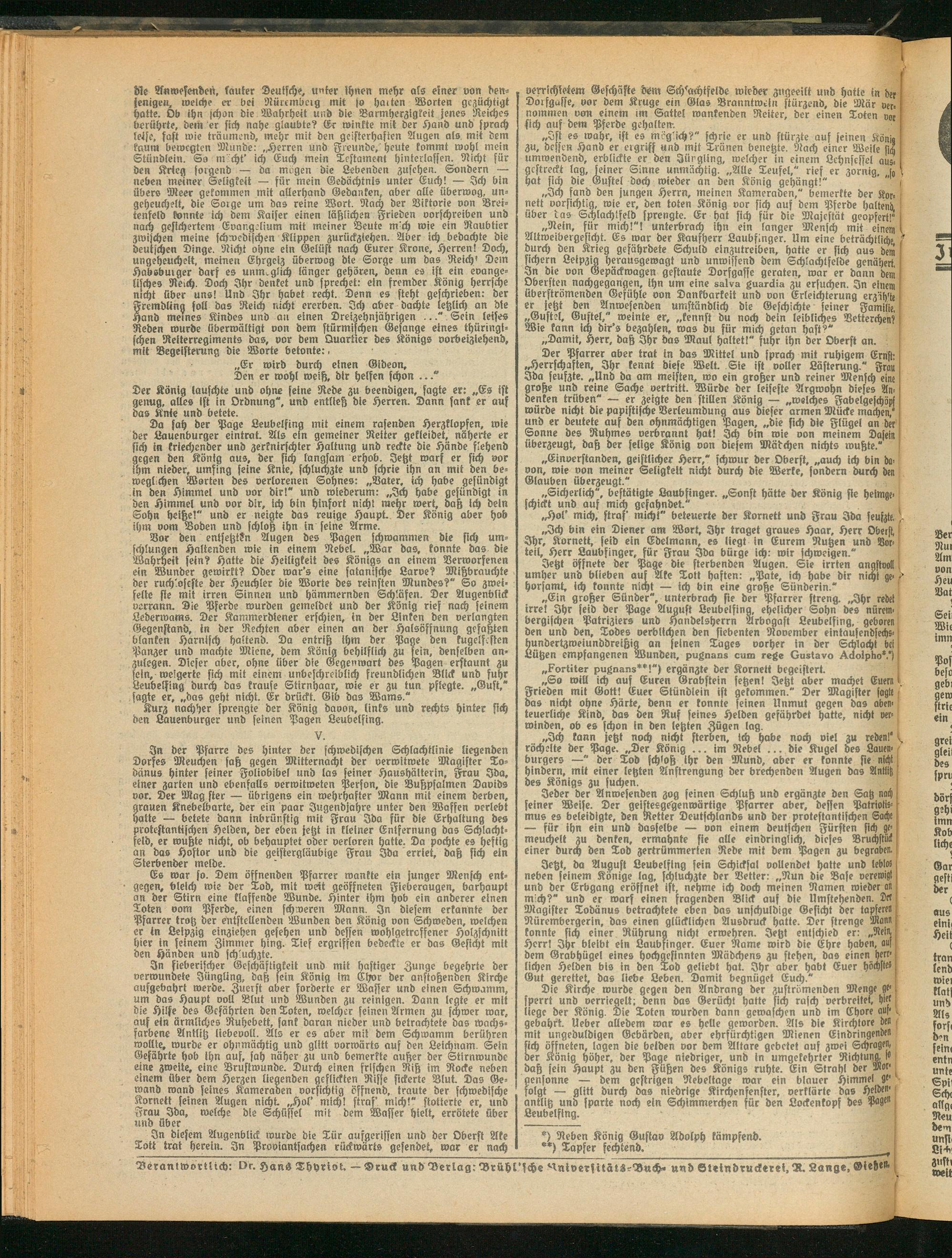 Jeder der Anwesenden zog seinen Schluß und ergänzte den Satz nach seiner Weise. Der geistesgegenwärtige Pfarrer aber, besten Patriotismus es beleidigte, den Retter Deutschlands und der protestantischen Sache — für ihn ein und dasselbe — von einem deutschen Fürsten sich gemeuchelt zu denken, ermahnte sie alle eindringlich, dieses Bruchstück einer durch den Tod zertrümmerten Rede mit dem tragen zu begraben.