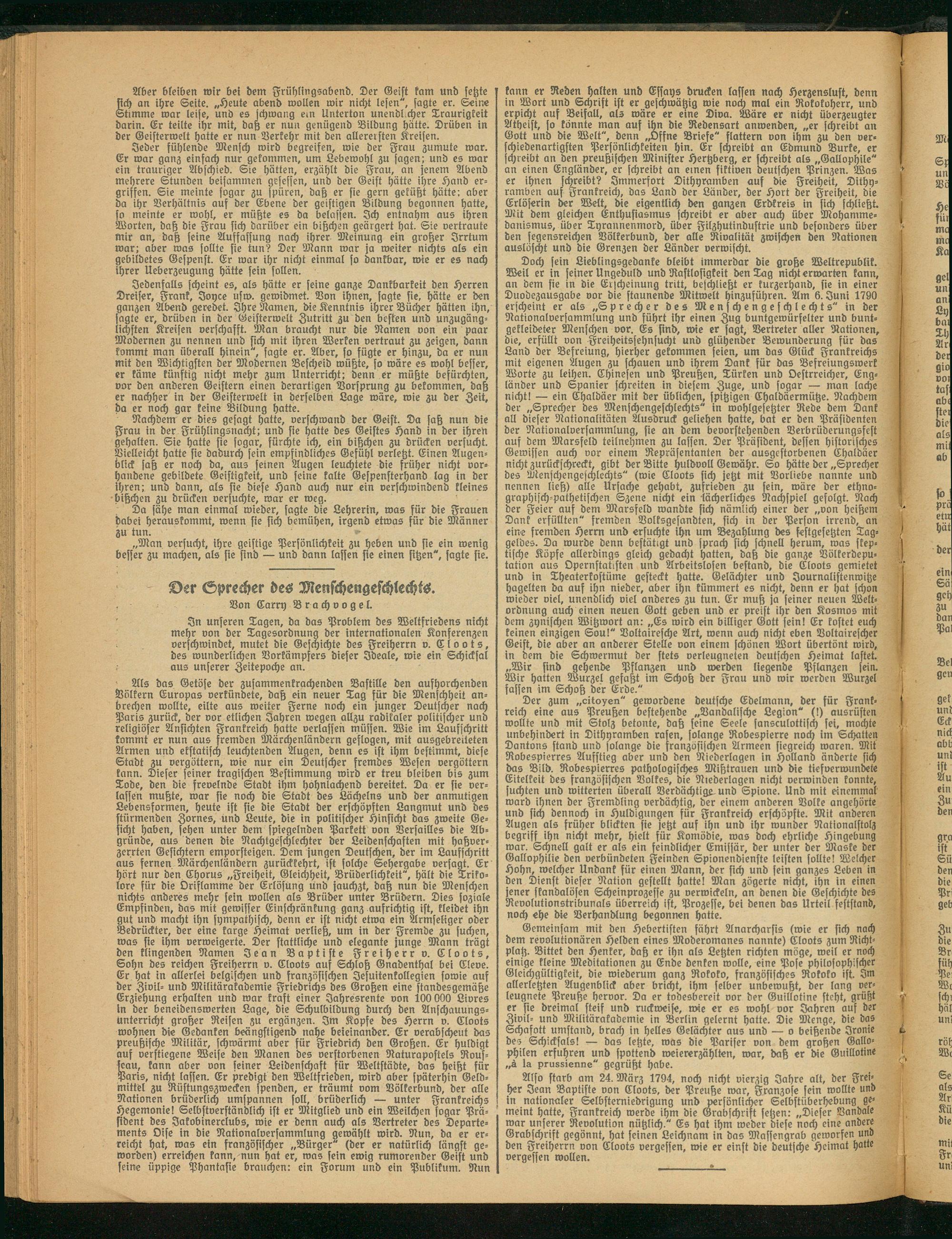 In unseren Tagen, da das Problem des Weltfriedens nicht mehr von der Tagesordnung der internationalen Konferenzen verschwindet, mutet die Geschichte des Freiherrn v. (Kloots, des wunderlichen Vorkämpfers dieser Ideale, wie ein Schicksal aus unserer Zeitepoche an.
