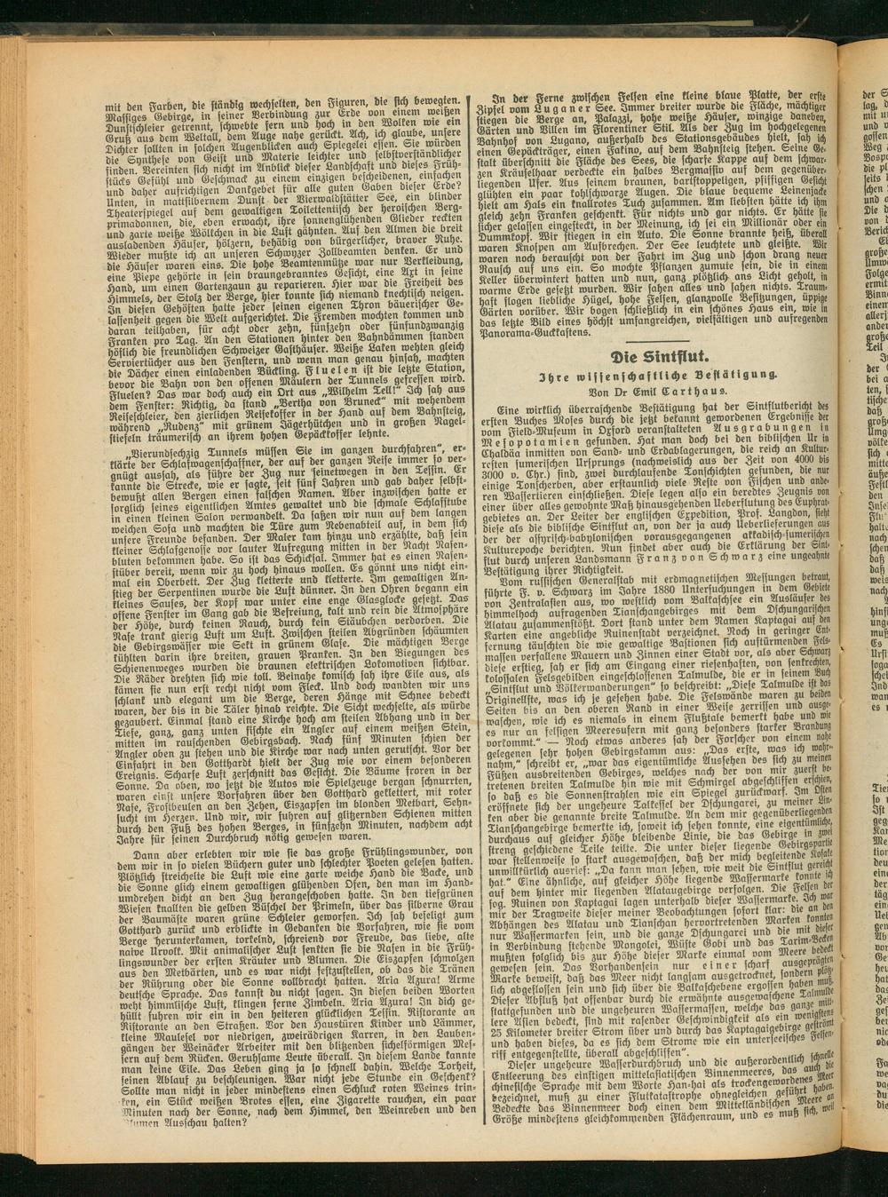 Eine wirklich überraschende Bestätigung hat der Sintflutbericht des ersten Buches Moses durch die jetzt bekannt gewordenen Ergebnisse der vom Field-Museum in Oxford veranstalteten 2t u s g r a bu njg e n m Mesopotamien gesunden. Hat man doch bei den biblischen Ur in Chaldäa inmitten von Sand- und Erdablagerungen, die reich an Kulturresten sumerischen Ursprungs (nachweislich aus der Zeit von 4000 bis 3000 v. Ehr.) sind, zwei durchlaufende Tonschichten gesunden, Die nur einige Tonscherben, aber erstaunlich viele Reste von Fischen und anderen Wassertieren einschließen. Diese legen also ein beredtes Zeugnis von einer über alles gewohnte Maß hinausgehenden Ueberslutung des Euphrai- qcbietcs an. Der Leiter der englischen Expedition, Prof. Langdon, sich diese als die biblische Sintflut an, von der ,a auch Ueberlieferungen ander der assyrisch-babylonischen vorausgegangenen akkadisch-sumeriichsn Kulturepoche berichten. Nun findet aber auch die Erklärung der Sintflut durch unseren Landsmann Franz von Schwarz eine ungeahnte ^^ Vom'russsichen^Gene^ralstab mit erdmagnetischen Messungen betraut, führte F. v. Schwarz im Jahre 1880 Untersuchungen in dem Gebiete von Zentralasien aus, wo westlich vom Balkaschsee em Ausläufer des himmelhoch aufragenden Tianschangebirges mit dem Dschungarischen Alatau zusammenstößt. Dort stand unter dem Namen Kaptagai aus den Karten eine angebliche Ruinenstadt verzeichnet. Noch in geringer Ent- fernunq täuschten die wie gewaltige Bastionen sich austurmenden Fels- masse/versallene Mauern und Zinnen einer Stadt vor, als aber Schwarz diese erstieg, sah er sich am Eingang einer riesenhaften, von senkrechten, kolossalen Felsgebilden eingeschlossenen Talmulde, die er in feinem Sud) Sintflut und Völkerwanderungen" so beschreibt: „Diese Talmulde ist te Originellste, was ich je gesehen habe. Die Felswände waren zu beiden Seiten bis an den oberen Rand in einer Weise zerrissen und ausg- waschen, wie ich es niemals in einem Flußtale bemerkt habe und « es nur an felsigen Meeresufern mit ganz besonders starker Brandung vorkommt." — Noch etwas anderes sah der Forscher von einem nahe gelegenen sehr hohen Gebirgskamm aus: „Das erste, was ich wahr- nahm " schreibt er, „war das eigentümliche Aussehen des sich zu meinen Füßen ausbreitenben Gebirges, welches nach der von m>r zuer t -- tretenen breiten Talmulde hin wie nut Schmirgel abgeschliffen ersch n (o daß es die Sonnenstrahlen wie ein Spiegel zuruckwarf. Jm unei eröffnete sich der ungeheure Talkessel der Dschungare,, zu meiner ^ fen ober die genannte breite Talmulde. An dem mir gegenubert egenben Tianfchangebirge bemerkte ich, soweit ich sehen konnte, °>ne eigentuml qe, durchaus auf gleicher Hohe bleibende Linie, die das Gebirge in ) streng geschiedene Teile teilte. Die unter dieser liegende GebirgsM war stellenweise so stark ausgewaschen, daß der mjd) beg!eitenbe mW. unwillkürlich ausrief: „Da kann man sehen, rote roett bie Sintflut gemq hat." Eine ähnliche, auf gleicher Hohe liegende Wassermarke konnte q auf dem hinter mir liegenden Alataugebirge verfolgen. Die Felsen ° sog. Ruinen von Kaptagai lagen unterhalb dieser Wassermarke. Ich w« mir der Tragweite dieser meiner Beobachtungen sofort klar, die an N Abhängen des Alatau und Tianschan hervortretenden Marken onn» nur Wassermarken sein, und die ganze Dschungarei und °ie mit in Verbindung stehende Mongolei, Wüste Gobi und das Tor A mußten folglich bis zur Hohe dieser Marke einmal vom Meer oe gewesen sein. Das Vorhandensein nur e i n e r scharf ausgepng Marke beweist, daß das Meer nicht langsam ausgetrotfnet, sondern pu 1 lieh abqeslossen sein und sich über die Balkaschebene ergossen haben ° . Dieser Abfluß hat offenbar durch die erwähnte ausgewaschene . stattgefiinden und die ungeheuren Wassermassen, welche das ganze i lere Asien bedeckt, sind mit rasender Geschwindigkeit als ein_ ®en ; 25 Kilometer breiter Strom über und durch das Kaptagaigebirg g i - und haben dieses, da es sich dem Strome wie ein unterseeische ü