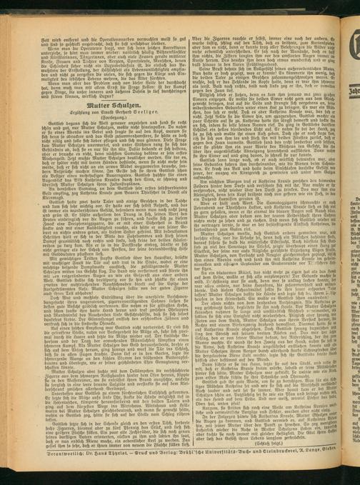 Mit gewichtigen Tritten stapfte Gottlieb über den Hausflur, druckte mit wuchtiger Faust die Tür auf und trat in die Stube, wobei er eine mächtige beizende Dampfwolke ausstieß, die zufälligerweise Mutter Schulzen mitten ins Gesicht flog. Die stand wie versteinert und stierte ihn mit uen rotgeränderten Augen an wie ein Gespenst aus einer andern Welt. Gottlieb stellte sich breitspurig vor sie hin und schickte ihr einen zweiten der wohlriechenden Rauchschwaden direkt auf die Spitze der ftarfgetrümmten Nase. Mutter Schulzen sollte von der guten Zigarre auch ihren Teil abhaben! m ,