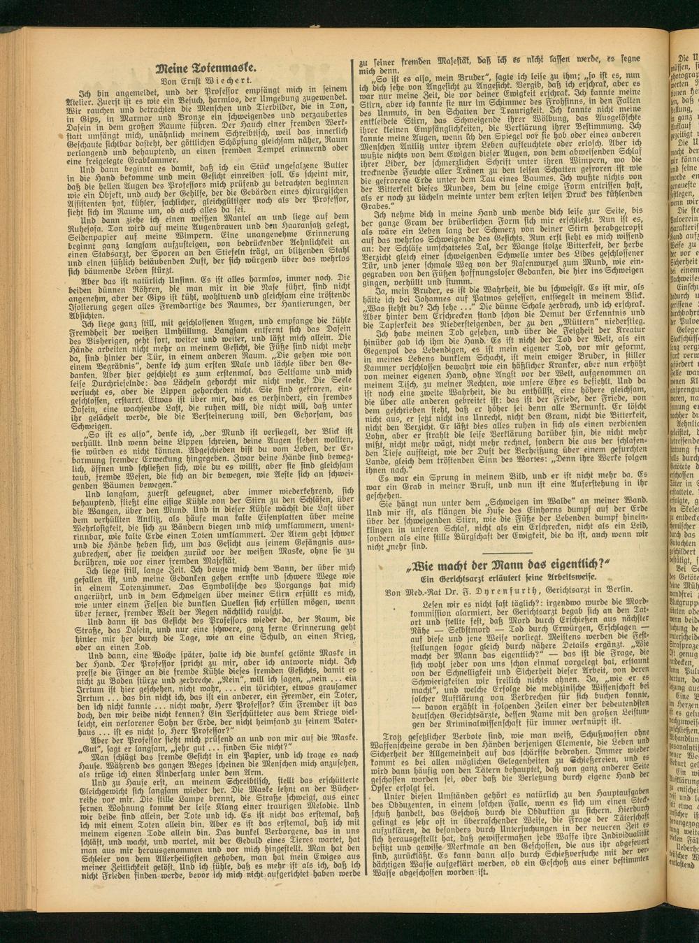 Und bann ist das Gesicht des Professors wieder da, der Raum, die I ort und stellte fest, daß Mord durch Erschießen aus nächster