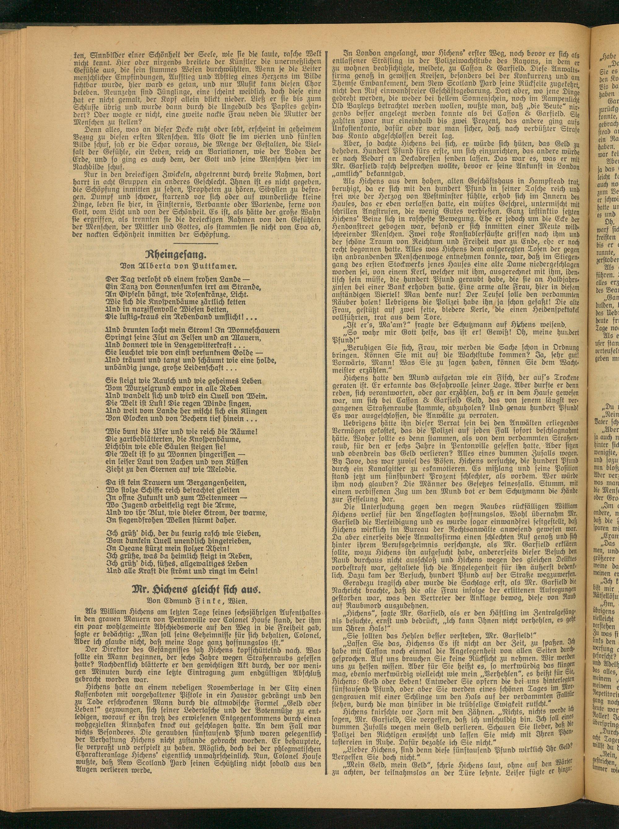 Als Hichens aus dem hohen, alten Geschäftshaus in Hampftead trat, beruhigt, da er sich mit den hundert Pfund in seiner Tasche reich und frei wie der Herzog von Westminster fühlte, erhob sich im Innern des Hauses, das er eben verlassen hatte, ein wüstes Geschrei, untermischt mit schrillen Angstrufen, die wenig Gutes verhießen. Ganz instinktiv setzten Hichens' Beine sich in rascheste Bewegung. Ehe er jedoch um die Ecke der Hendonstreet gebogen war, befand er sich inmitten einer Meute wild- schreiender Menschen. Zwei rohe Konstablerfäuste griffen nach ihm und der schöne Traum von Reichtum und Freiheit war zu Ende, ehe er noch recht begonnen hatte. Alles was Hichens dem aufgeregten Tosen der gegen ihn anbrandenden Menschenwoge entnehmen konnte, war, daß im Stiegengang des ersten Stockwerks jenes Hauses eine alte Dame niedergeschlagen worden sei, von einem Kerl, welcher mit ihm, ausgerechnet mit ihm, identisch sein müsse, die hundert Pfund geraubt habe, die sie an Halbjahrszinsen bei einer Bank erhoben hatte. Eine arme alte Frau, hier in diesem anständigen Viertel! Man denke nur! Der Teufel solle den verdammten Räuber holen! Uebrigens die Polizei habe ihn ja schon gefaßt! Die alte Frau, gestützt auf zwei fette, biedere Kerle, die einen Heidenspektakel vollführten, trat aus dem Tore.