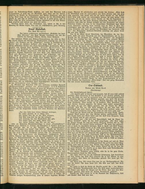 In München hat Wedekind 1890 fein modernes erotisches Pasquill „Frühlingserwachen" gedichtet, eine „Kindertragödie". E. T. A. Hoffmann und Büchner sind in diesen Szenen, in denen die Mitglieder eines Lehrerkollegiums Sonnenstich, Affenschmalz, Knüppeldick, Hungergurt, Knochenbruch, Zungenschlag und Fliegentod heißen; Fluch und Schauer der Pubertät und Harsenmelodien an frischen Gräbern werden durch ein gellendes Gelächter übertönt, das Gelächter Satans. 1896 trat Wedekind wieder in München in den Vordergrund durch den „Simplizissimus" Albert Langens. Die ersten Nummern enthalten seine Gedichte, die dann in den „Vier Jahreszeiten" gedruckt werden, und die Novellen des Bandes „Die Fürstin Rusialka". Er ist nun der Dichter des „Erdgeists", des Dramas von Lulu, der paradiesischen Schlange und Mörderin, in dessen Prolog er selbst als Tierbändiger „in zinnoberrotem Frack, weißer Krawatte, langen, schwarzen Locken, weihen Beinkleidern und Stulpen« ftiefeln", mit der Hetzpeitsche klatscht und einen Revolver ins Publikum feuert: