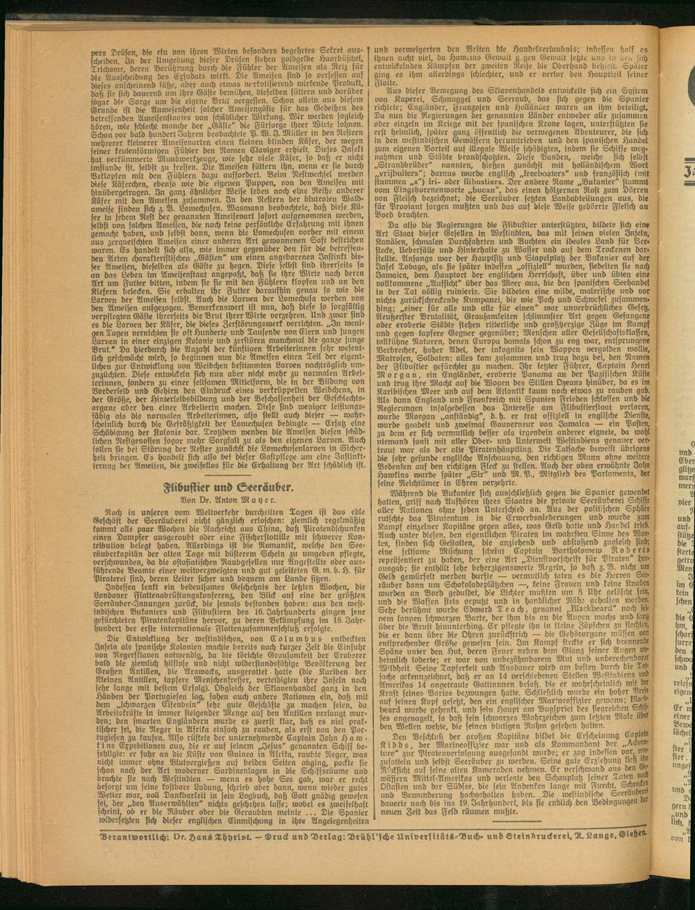 Noch in unseren vom Weltverkehr durcheilten Tagen ist das edle Geschäft der Seeräuberei nicht gänzlich erloschen: ziemlich regelmäßig kommt alle paar Wochen die Nachricht aus China, daß Piratendschunken einen Dampfer ausgeraubt oder eine Fischerflottille mit schwerer Kontribution belegt haben. Allerdings ist die Romantik, welche den Seeräuberkapitän der alten Tage mit düsterem Schein zu umgeben pflegte, verschwunden, da die ostasiatischen Raubgesellen nur Angestellte oder ausführende Beamte einer weitverzweigten und gut geleiteten G. m. b. H. für Piraterei sind, deren Leiter sicher und bequem am Lande sitzen.