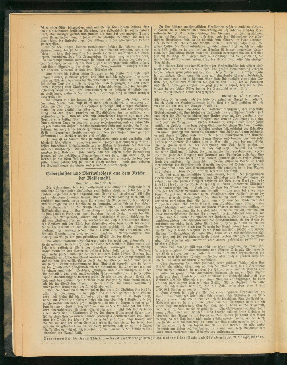 Verantwortlich: Dr. Hans Thyriot. - Druck und Verlag: Vrühl'sche Universitäts-Buch, und Steindruckerei, D. Lange, Gießen.